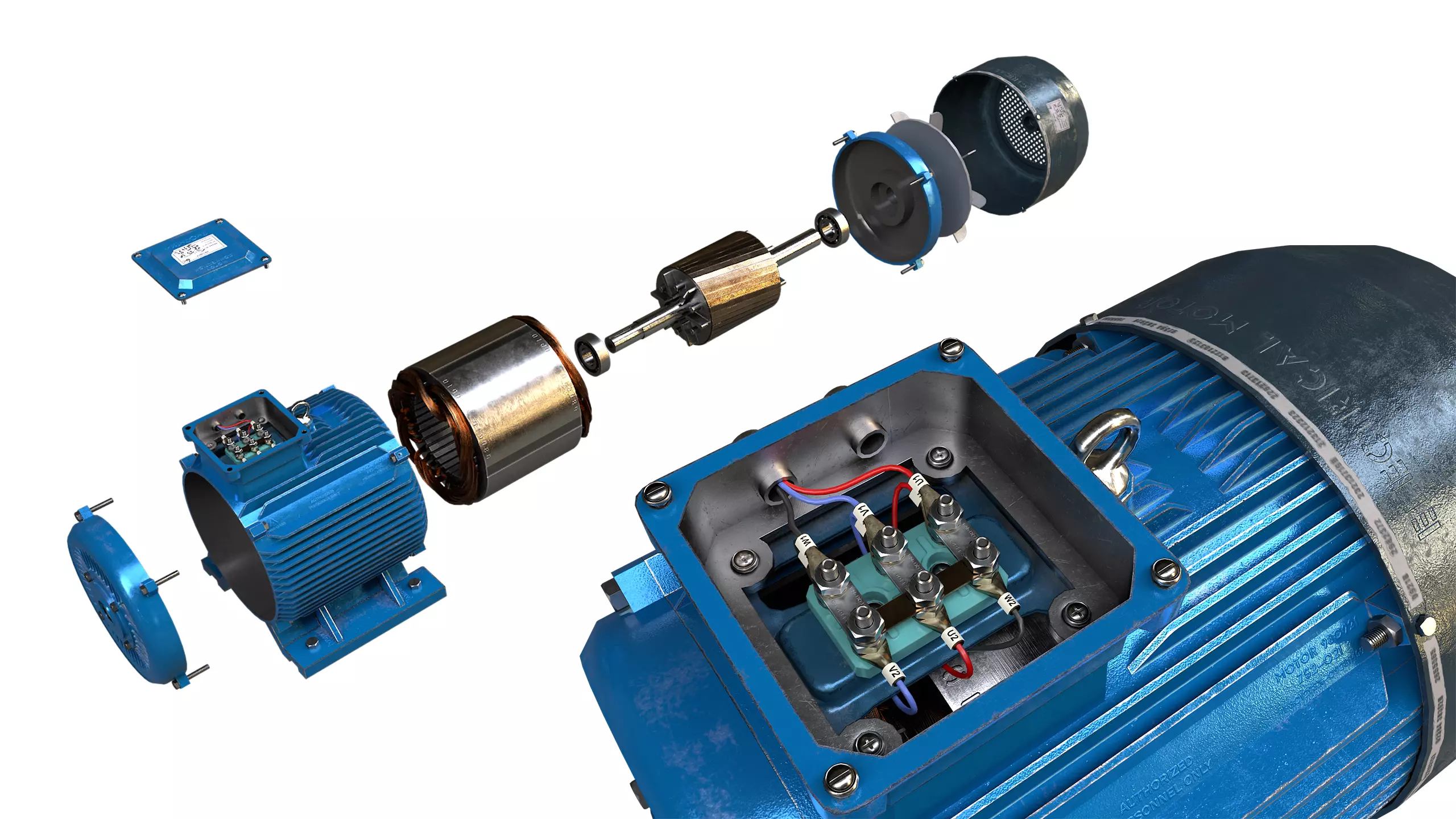 Detailed rotor, stator, cooling fan, bearings, shaft, terminal box