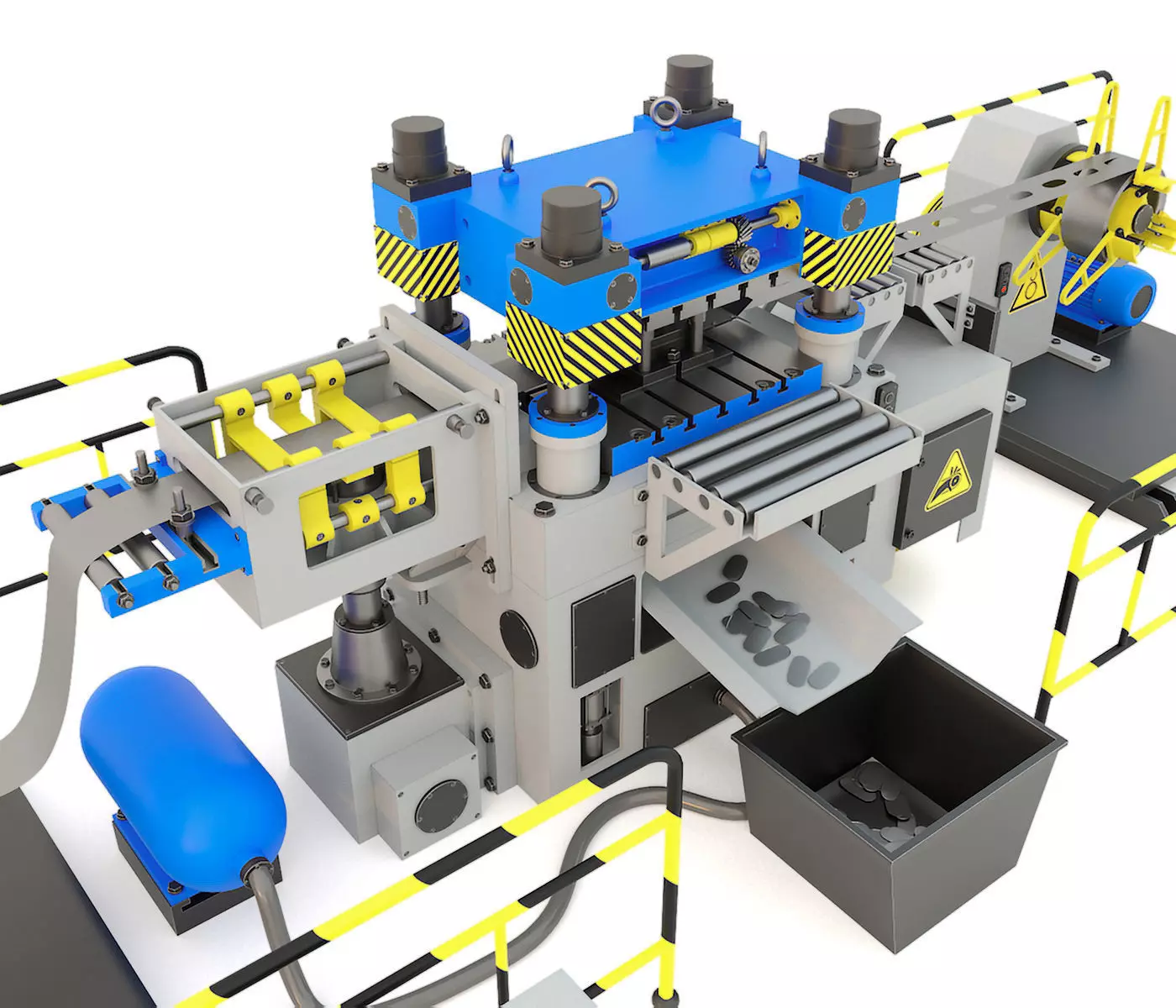 3d model: We recommend to purchase a detailed and high-quality industrial model of the equipment called the stamping line as part of the AB6230 press machine. This project was created on the basis of real-life equipment of this type and of course consists of a fairly large number of various elements and parts. If you list the main ones, then there is an unwinding device, a feeding device, a receiving device, electric motors, a control panel, industrial fences, a press machine itself, and of course the stamping mechanism itself is modeled in detail, which generally characterizes the capabilities of this interesting and modern equipment. In fact, here is a 3D model of an entire factory for working with metal products, which are obtained in the process of working by stamping. Together and at the output, we have a very high-quality model of a whole complex of equipment that can be perfectly and, of course, successfully integrated into an industrial project for the purpose of subsequent photorealistic visualization.