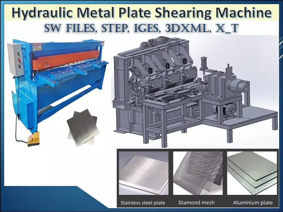 Heavy-duty Sheet Cutting Machine 3D CAD model designed for precision cutting of metal and non-metal plates in industrial manufacturing environments. This machine supports stainless steel, aluminum, iron, copper, diamond mesh, plastic sheets, PCB boards, and composite materials.Built with a rigid welded frame and high-strength cutting blade system, the shearing mechanism ensures clean edges, dimensional accuracy, and stable performance in continuous production operations.