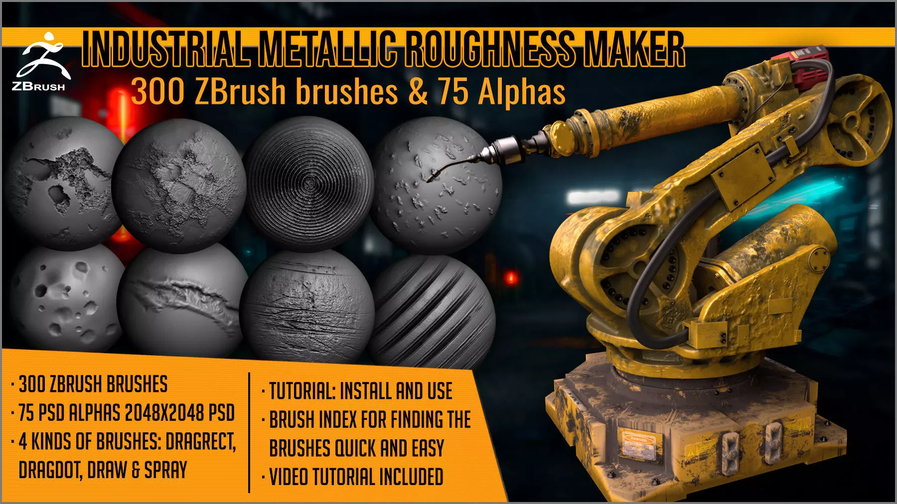 Industrial Metallic Roughness Maker for ZBrush contains many brushes for detailing, and sculpting all kinds of rust, damage, bumps, roughness and aging on industrial, sci-fi and fantasy scenes.Use them for detailing robots, machines, rusty metal, armor, weapons, damaged iron, bumpy inorganic surfaces, damaged metals, dirt, grunge, scratches, grit, and all that you can imagine.