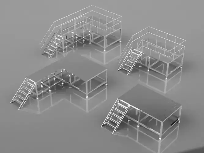 Industrial Mezzanine Platform with Steps features a 3D model of a stainless steel mezzanine system designed for factory, warehouse, and industrial environments.