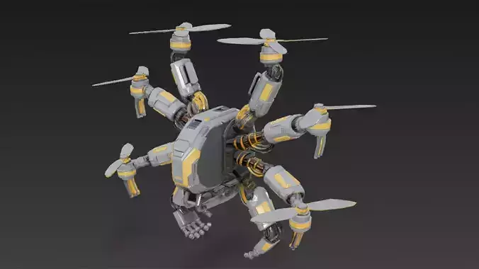 The multi-arm structure gives the drone a strong mechanical presence, making it ideal as a centerpiece asset for factories, cyberpunk worlds, or advanced industrial scenes. Its design balances realism with a bold sci-fi aesthetic.