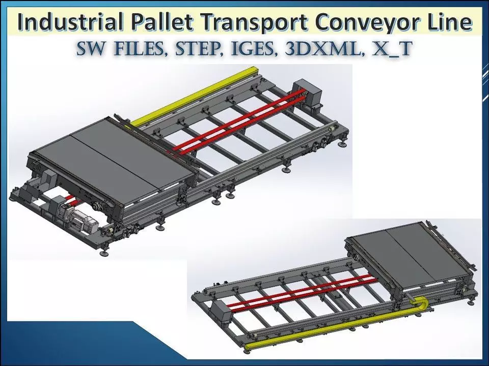 Industrial Transporting Pallet Conveyor 3D CAD model designed for automated movement of pallets and heavy materials across manufacturing and warehouse environments. The conveyor system provides reliable pallet transportation between production stations, storage areas, and packaging lines, improving workflow efficiency and reducing manual handling.The machine utilizes a motor-driven conveyor mechanism with rollers or belt-driven transport rails to move pallets smoothly along the production line. The structural frame supports heavy loads while ensuring stable and continuous movement during operation.This system often integrates guide rails, positioning stops, drive motors, sensors, and control systems to ensure accurate pallet alignment and safe material transfer. Pallet conveyors are commonly used in automated assembly lines, warehouse logistics systems, and industrial material handling operations.The CAD assembly demonstrates essential engineering principles used in industrial conveyor design, pallet transfer automation, and manufacturing line material flow systems, making it suitable for factory automation design, mechanical engineering projects, and industrial equipment development.Key Features• Automated pallet transportation system• Heavy-duty industrial frame structure• Motor-driven conveyor mechanism• Smooth pallet transfer operation• Integrated guide and alignment rails• Suitable for automated production lines• Modular conveyor system design• Detailed industrial CAD assemblyMain Components• Conveyor drive motor• Roller or belt transport mechanism• Structural frame and support base• Pallet guide rails• Transmission shafts and couplings• Positioning stops and brackets• Electrical control system• Mounting feet and support legsTypical Applications• Automated manufacturing lines• Warehouse pallet transport systems• Assembly line material handling• Logistics and packaging facilities• Industrial storage systems• Factory automation equipment