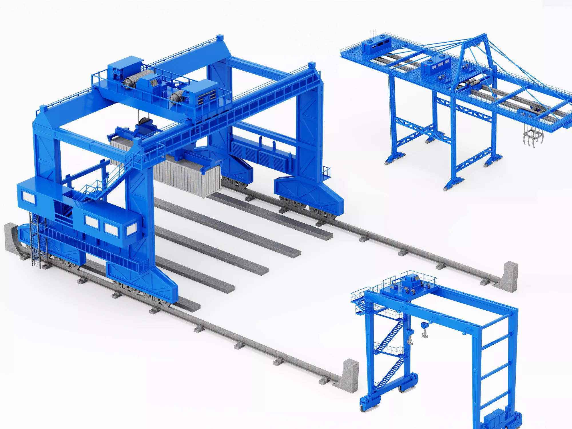 Professional high-quality 3D collection of Industrial Port Gantry Cranes and Container Handling Systems meticulously crafted for realistic maritime logistics visualization and terminal environment projects. This set features three distinct heavy-duty cranes including a large rail-mounted gantry crane with detailed trolley and spreader a quay crane for ship-to-shore operations and a mobile rubber-tyred gantry crane with realistic mechanical components.