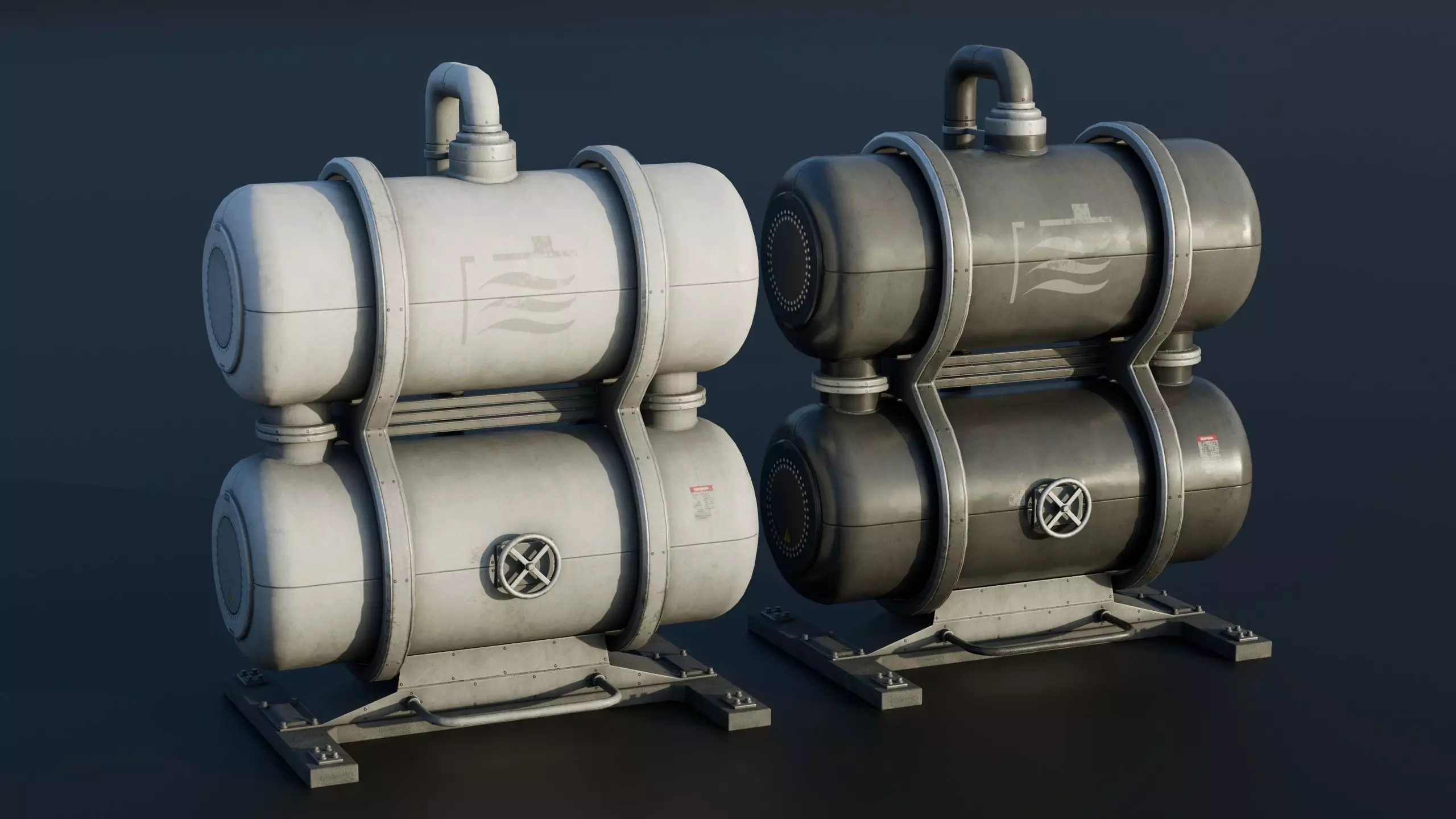 This 3D model represents an industrial roof tank system featuring two large storage units designed for ventilation or fluid processing setups. The pack includes both white and black variants. Fully optimized for real-time use with high-resolution baked textures and PBR materials, ideal for games, visualization, and industrial environment design. Part of the Roof Elements Pack.