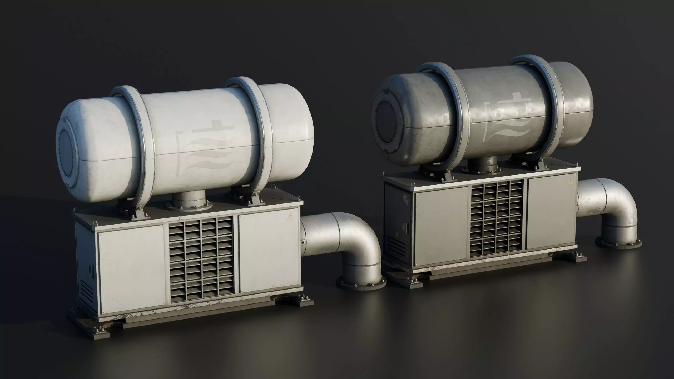This 3D model represents an industrial roof tank system featuring one large tank / vent units designed for ventilation or fluid processing setups. The pack includes both white and black variants. Fully optimized for real-time use with high-resolution baked textures and PBR materials, ideal for games, visualization, and industrial environment design. Part of the Roof Elements Pack.