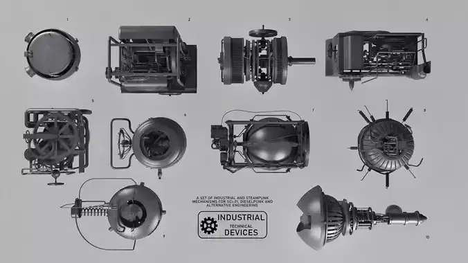 Collection of detailed industrial mechanical devices designed for sci-fi and industrial environments. The set includes generators, engines, turbines, reactors, and technical modules with complex hard-surface construction. Each model features a realistic industrial design and is suitable for games, cinematics, and real-time projects. Perfect for factories, power plants, laboratories, and futuristic environments.