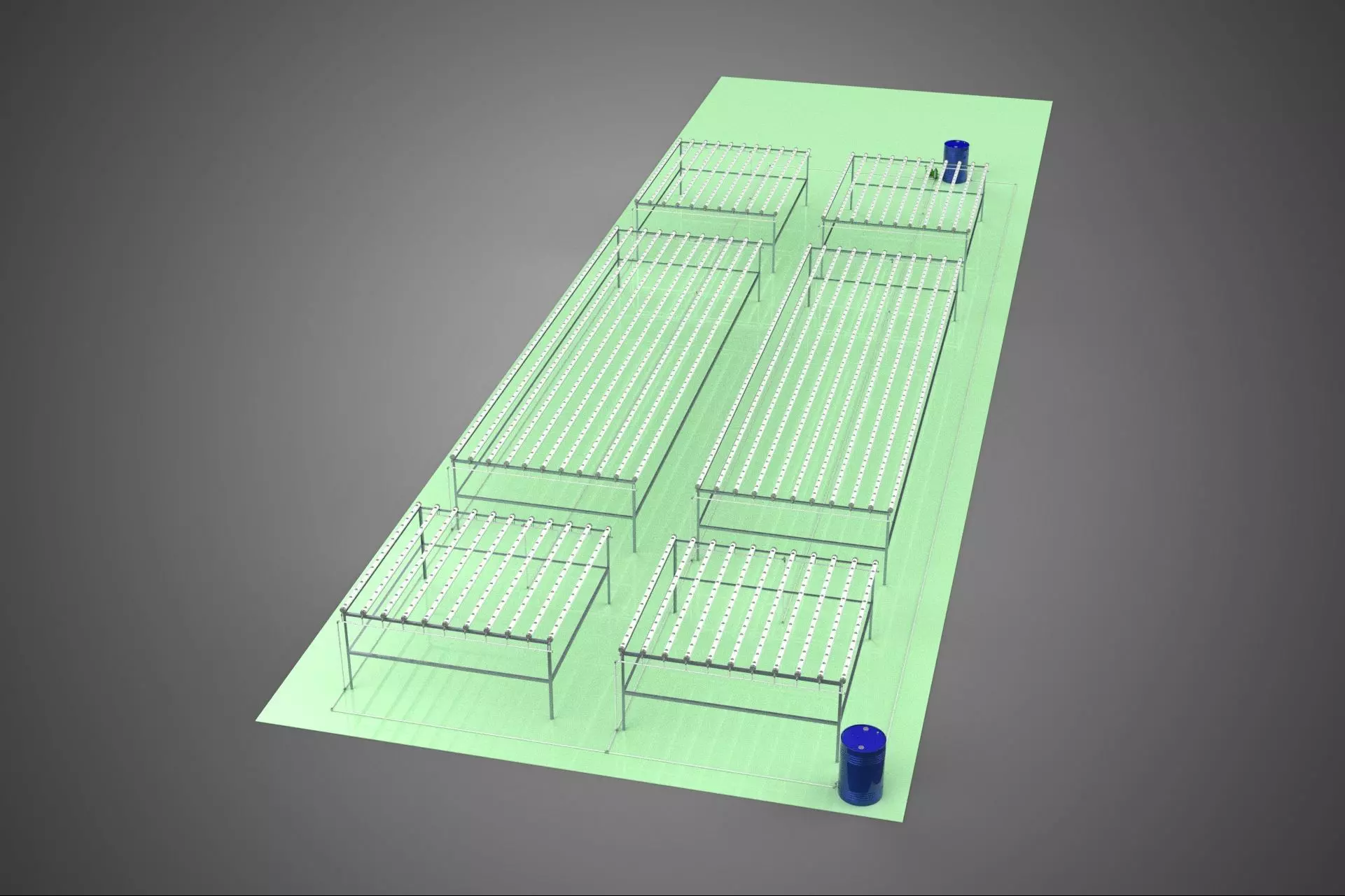 The arrangement is strictly modular, consisting of parallel, elevated rows structured as an array. This standardization ensures uniform light exposure and simplifies the implementation of climate control (e.g., supplemental LED lighting, cooling/heating, CO₂ injection) within enclosed environments such as greenhouses or vertical farms. The elevated structure mitigates potential ground contamination and allows for ergonomic access during planting and harvesting cycles. The dense row layout optimizes plant population density per square meter of facility footprint.