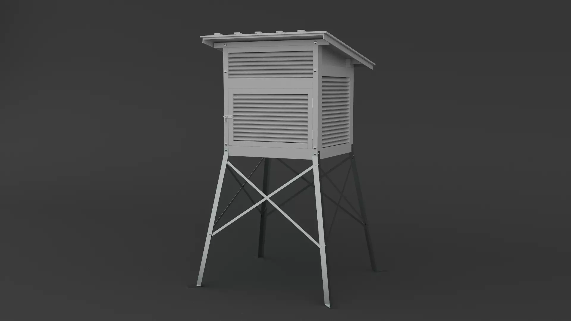 Stevenson screen used for housing meteorological sensors to protect them from direct sunlight, precipitation, and external heat influence.This model represents a typical weather instrument shelter commonly used in environmental monitoring and observation facilities.It is not modeled to real-world engineering specifications and is intended for visual and conceptual use only.