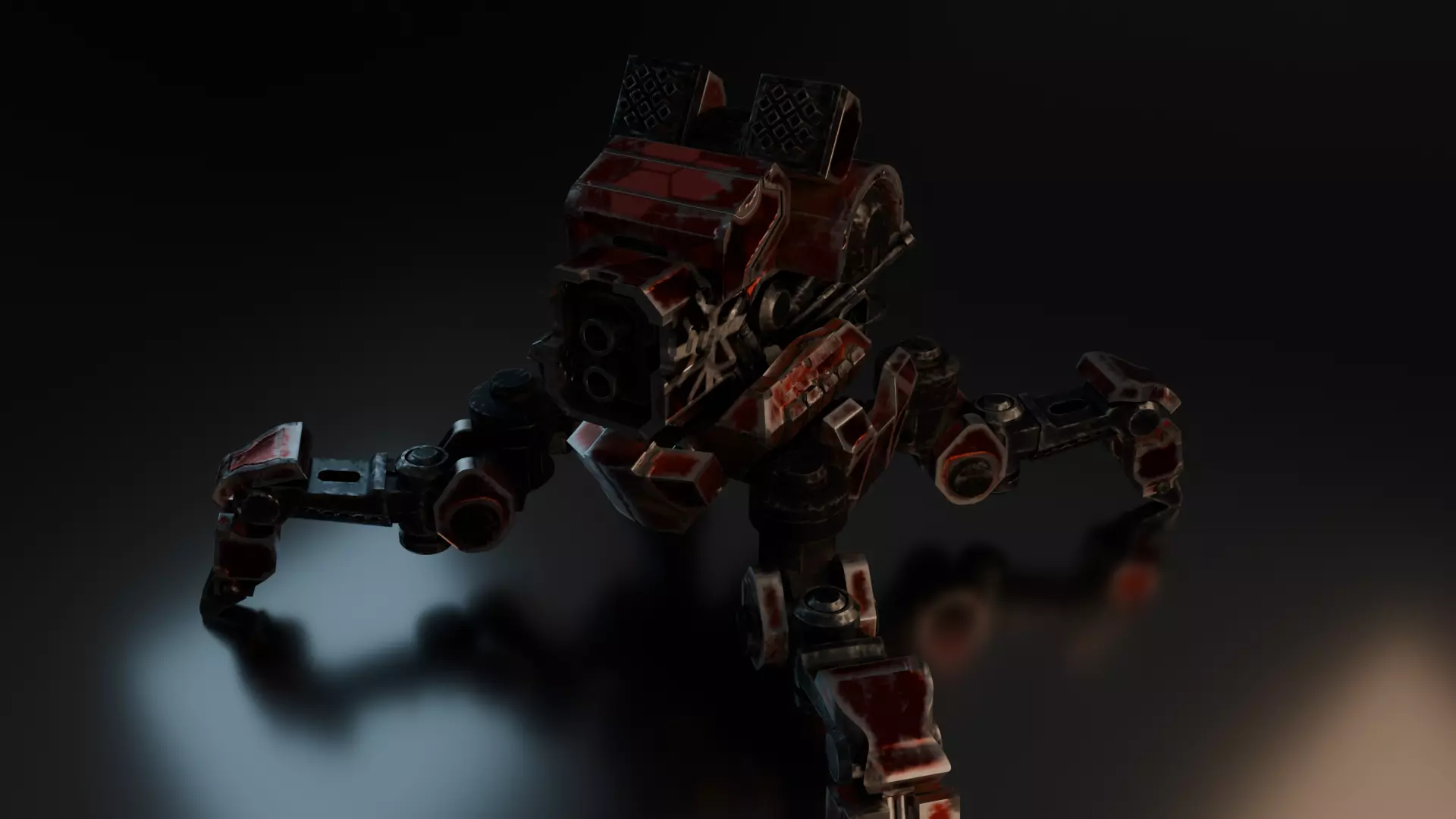 Características Generales:Diseño Mecánico: Este robot cuenta con cuatro patas articuladas que le otorgan una movilidad excepcional, ideal para moverse en terrenos irregulares o zonas de combate intensas.Cañón Integrado: Montado en la parte superior del robot, el cañón es el arma principal, diseñado para disparos de largo alcance. Su posición estratégica permite una rotación completa para cubrir múltiples ángulos.Color y Texturización: El cuerpo del robot está pintado de rojo intenso, con un acabado desgastado que refleja el rigor de los combates.Detalles Estéticos:Daños en el Blindaje: Las texturas del casco blindado muestran marcas de soldaduras visibles y áreas desgastadas, lo que enfatiza su uso en conflictos prolongados. Estas imperfecciones le otorgan un carácter realista y auténtico.Signos de Batalla: Manchas de suciedad, rayones, y desgaste adicional en las patas y el cañón refuerzan su historia de supervivencia en múltiples enfrentamientos.Blindaje Reforzado: Pese a las marcas de combate, la estructura blindada denota su capacidad de resistir impactos severos.