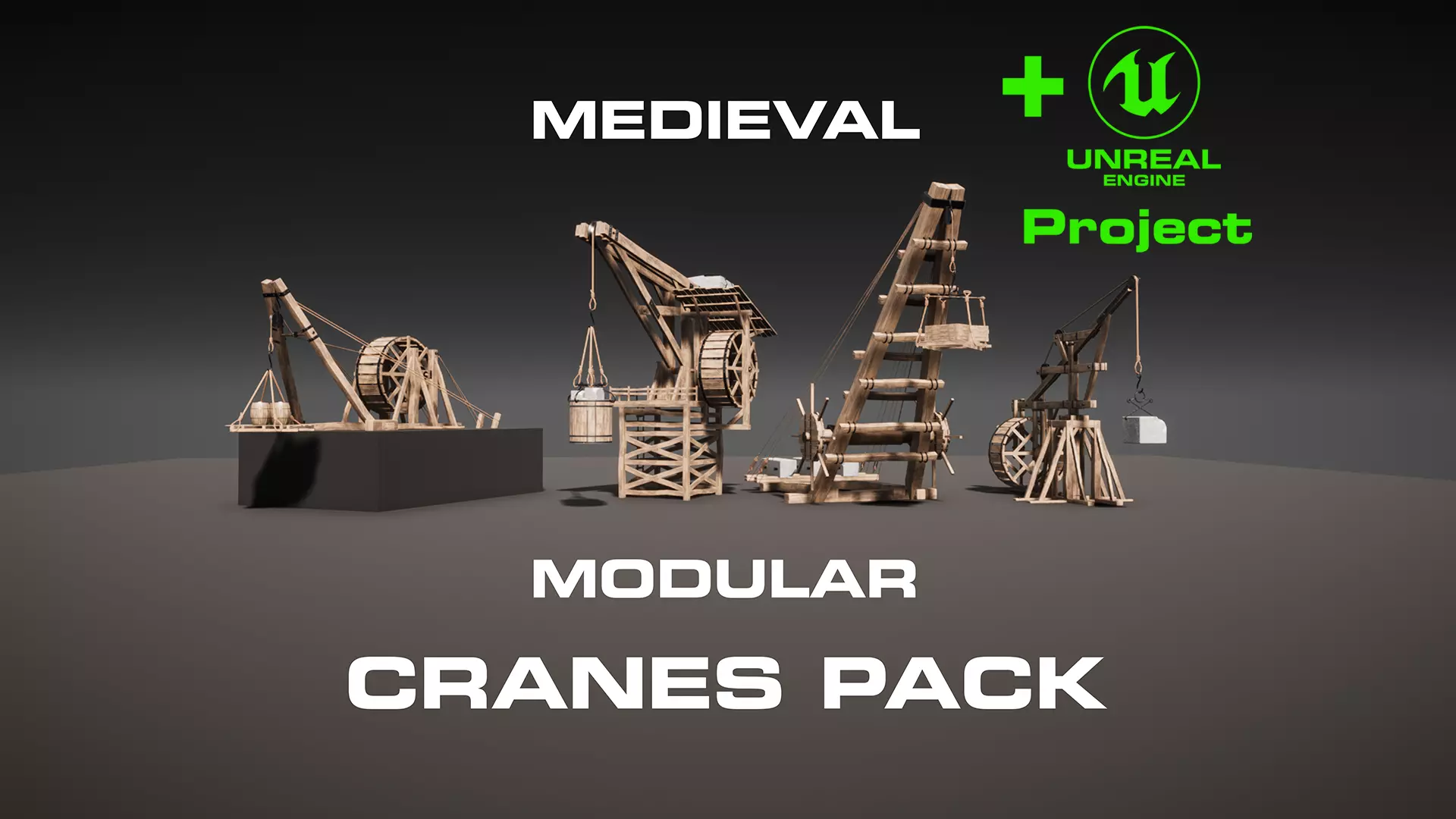 4 Types Low poly Medieval Cranes Pack with 4 modular cargo holders and props.