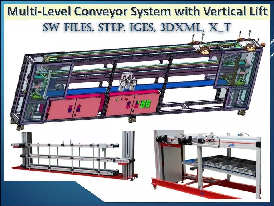 High-detail multi-level conveyor system 3D CAD model featuring pneumatic or electric lift mechanisms, designed for efficient container handling, buffering, and circulation in space-constrained production environments. The system is modular, vertically optimized, and suitable for fully automated operation.Key Features• Multi-level buffer conveyor design for optimal space utilization• Integrated pneumatic or electric lift system• Configurable with single-lift or dual-lift circulation layout• Automatic container transport between multiple conveyor levels• Modular belts with customizable length, width, material, and layout• Designed for continuous container buffering and material flow controlAutomation & Control• Integrated PLC-controlled system (industrial standard architecture)• Fully automated operation suitable for unmanned night shifts• Control logic adaptable to specific production requirements• Supports advanced functions such as sorting, buffering, and decoupling of processesOptional & Advanced Configurations• Swivel distributors for controlled container filling• Anti-spillage conveying solutions• Multi-track lift systems• Cleanroom-compatible versions• Rotating lift conveyors and cross-slide integration• Safety fencing, chutes (pneumatic or electric), and special guardingTypical Applications• Container buffering & intermediate storage• Production-to-packaging decoupling• Automated sorting systems• Space-optimized factory layouts• High-throughput manufacturing lines