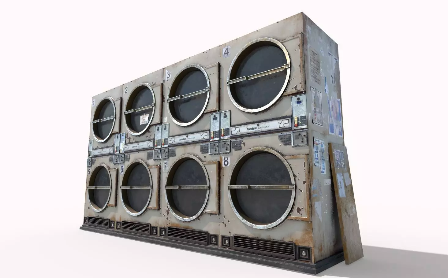 Model of old Laundromat. Model is very realistic. It has 8 PBR materials. Maps are diffuse - specular - glossiness - height -opacity and normal. Also, PBR Metallic-Roughness ( Basecolor- Metallic- Normal-Roughness- Height-Opacity ) workflow has been added. Model's textures has two sizes; 4096x4096-2048x2048. All maps are PNG formats .