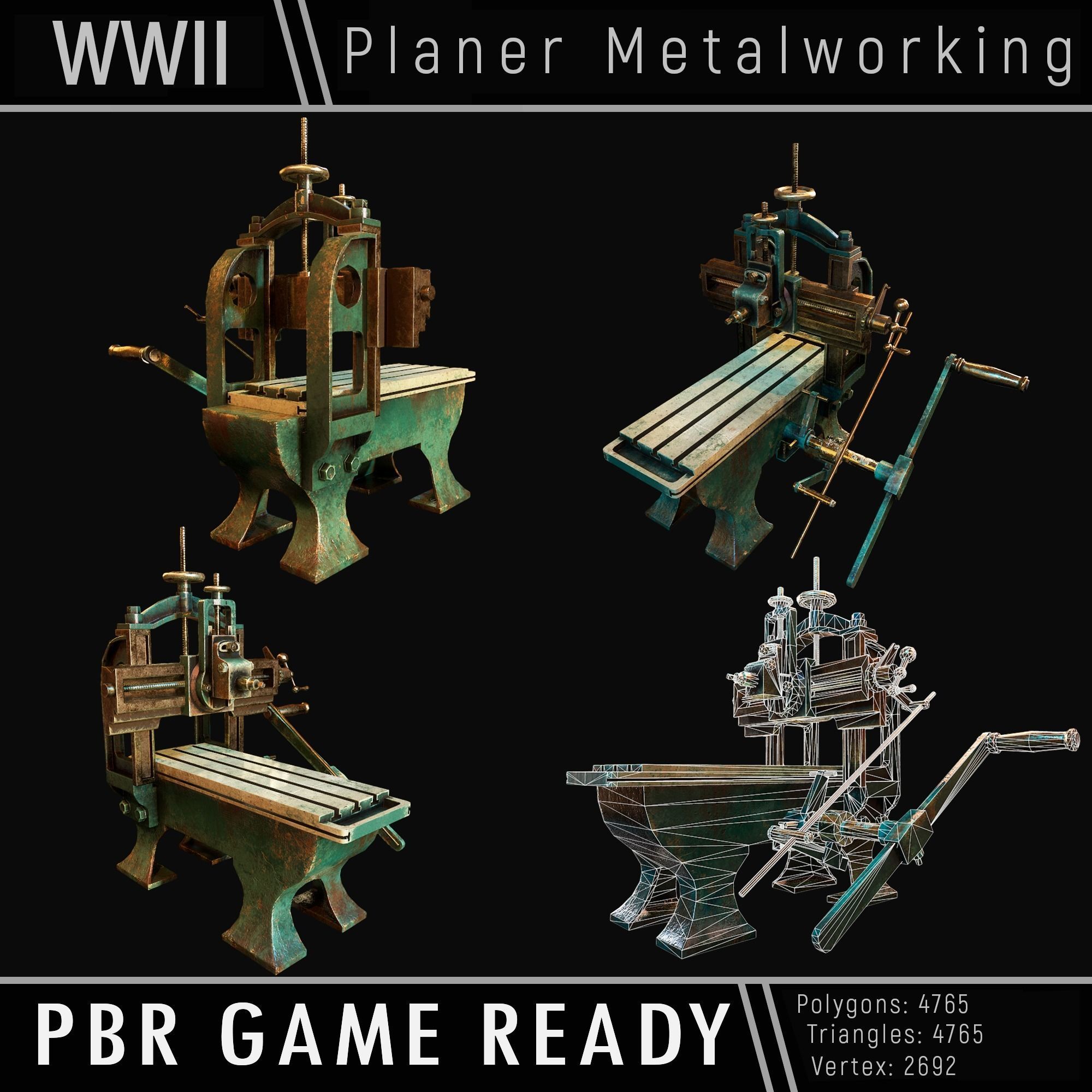 This is a PBR/Low Poly Game Ready 3d model of Planer Metalworking from the World War II, of the highest quality. The package includes:-Game Ready low-poly mesh of Planer Metalworking-PBR textures pack-Unity Package-FBX\OBJ-Marmoset toolbag scene