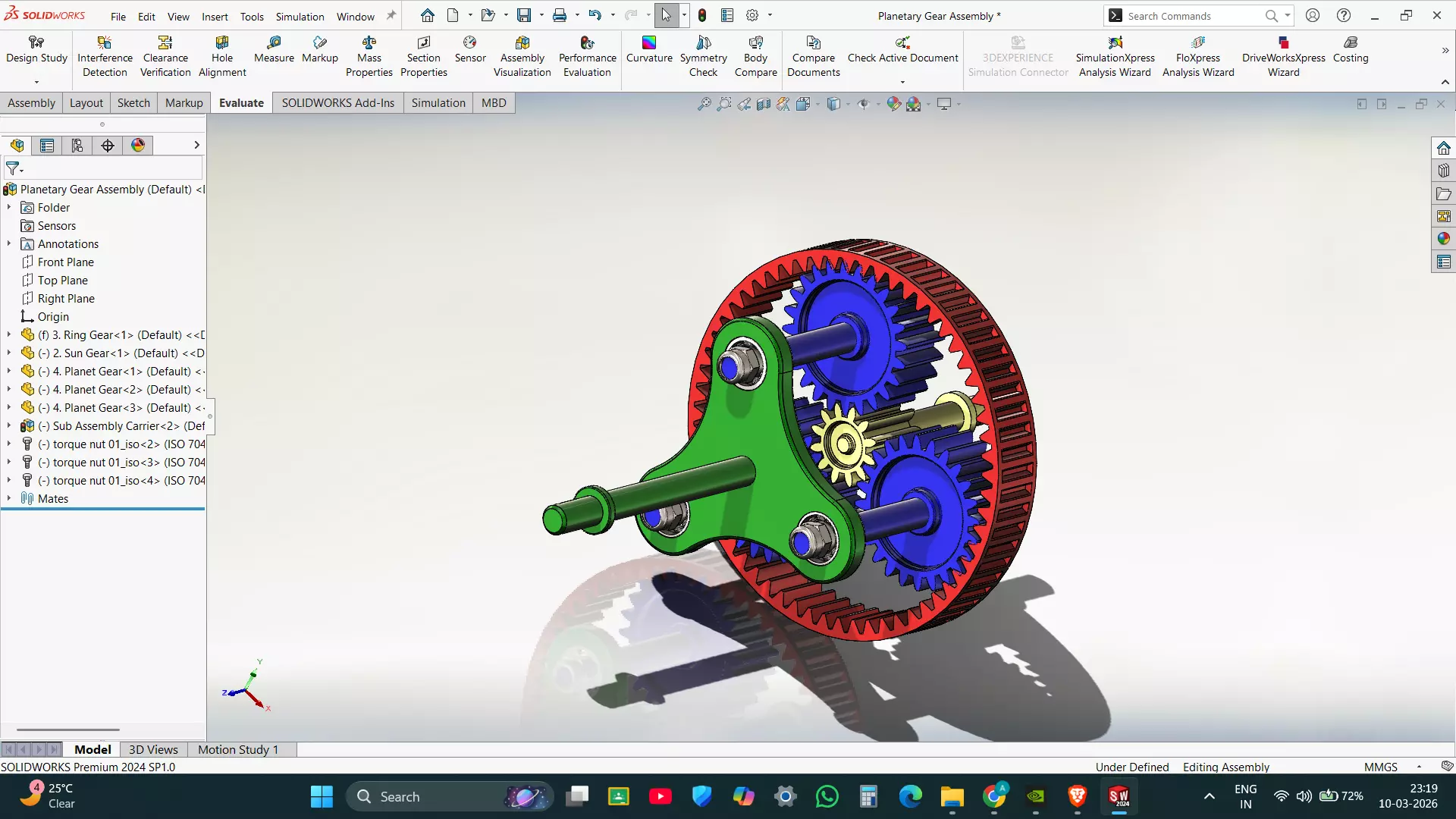 This is a detailed Planetary Gear Assembly (Epicyclic Gear Train) designed in SolidWorks.
