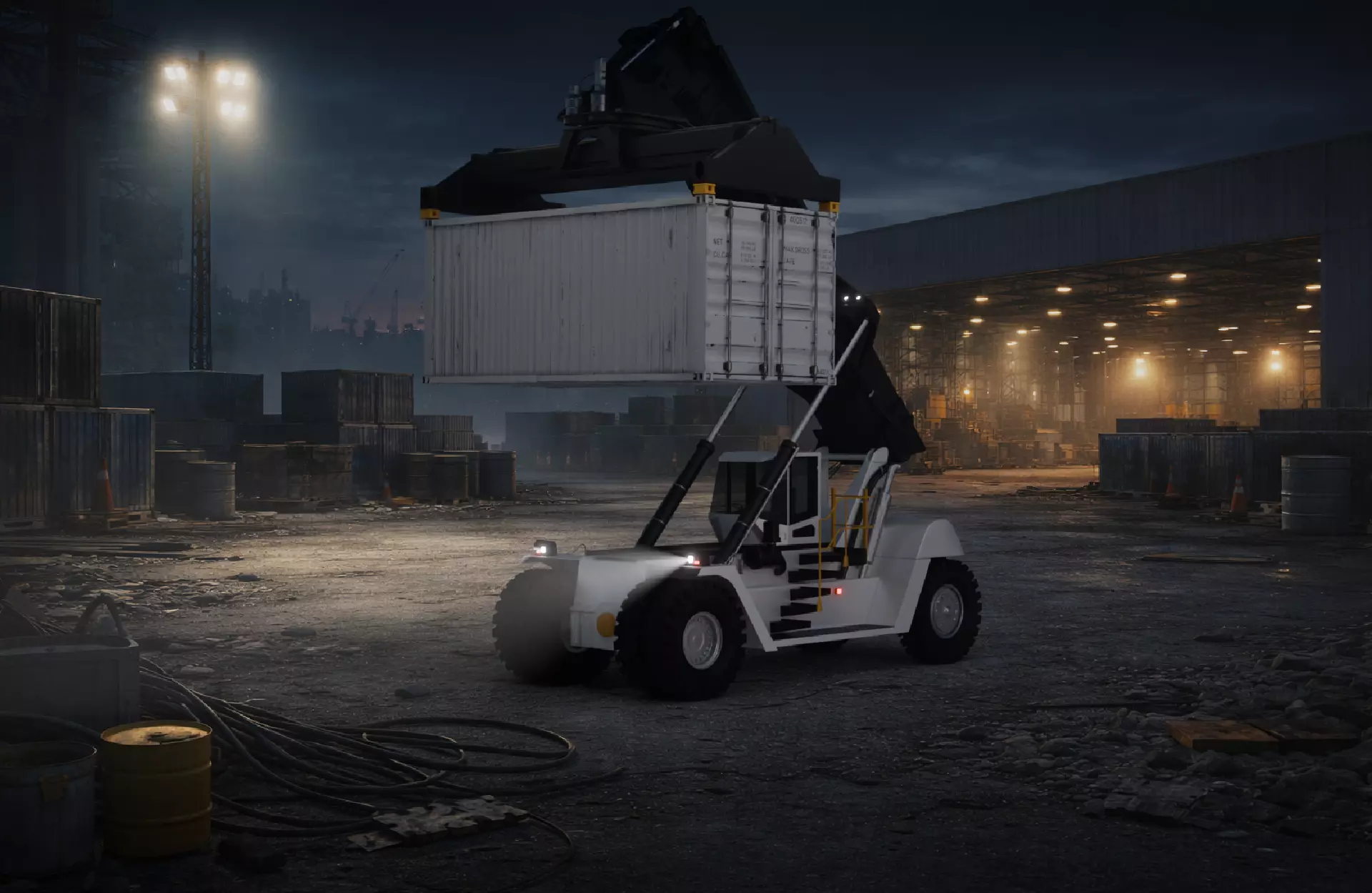 Professional, high-quality Reach Stacker 3D model designed for realistic industrial, port, logistics, and heavy machinery visualizations.