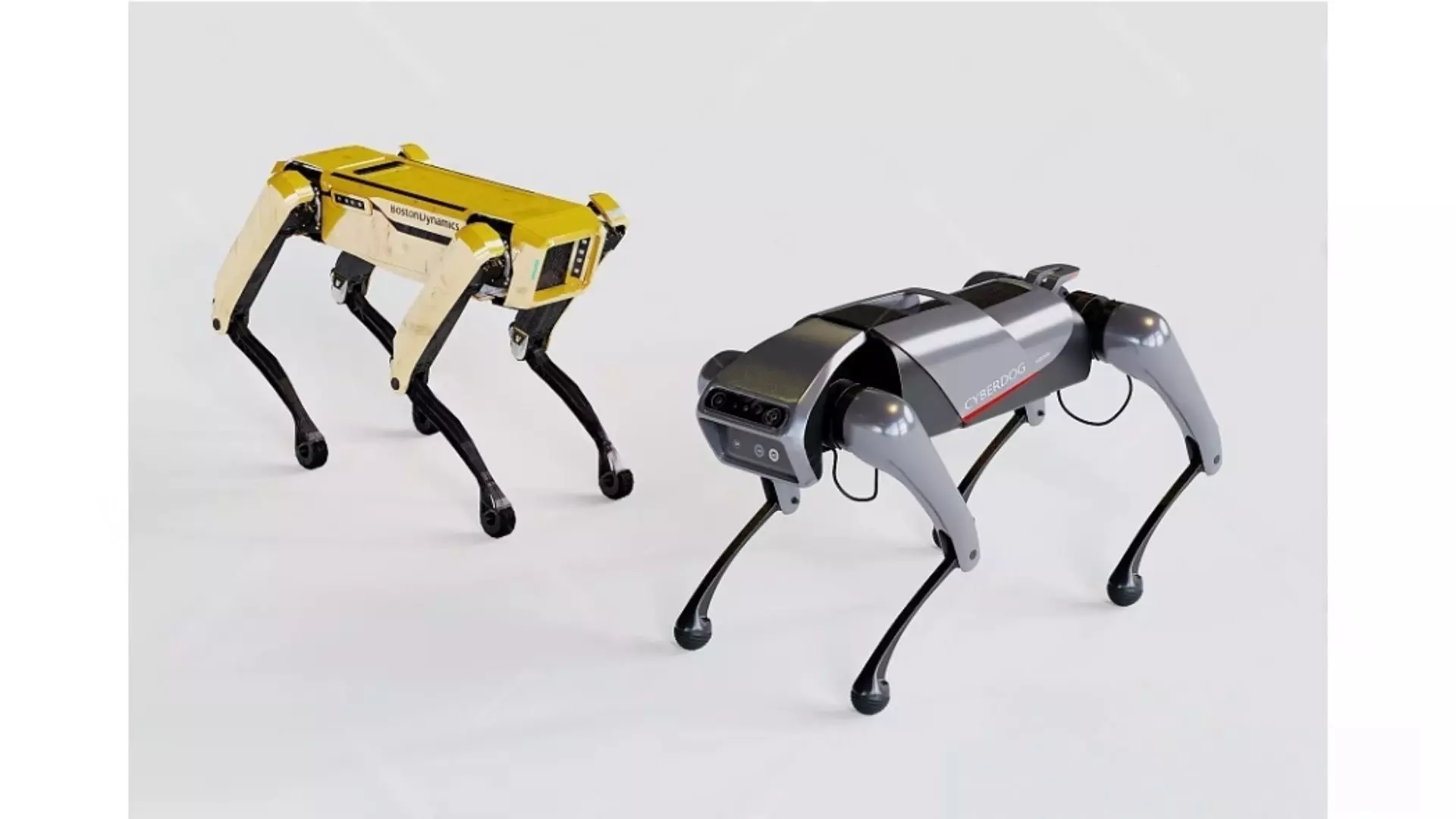 This picture shows two quadruped robots.The robot on the left features a main body in a combination of yellow and beige, with relatively slender black leg structures. It has the Unitree logo on its body, and its overall design exudes a strong sense of technology.The robot on the right uses silver-gray as its main color tone, with a rounder and smoother appearance. It also has black legs, and the word CyberDog is displayed on its body. Equipped with devices such as sensors on its head, it looks more exquisite and fully functional.Both robots adopt a bionic quadruped structure. Set against a simple white background, their sense of technology and mechanical aesthetics are particularly prominent, demonstrating the current design and technical styles in the field of quadruped robots.
