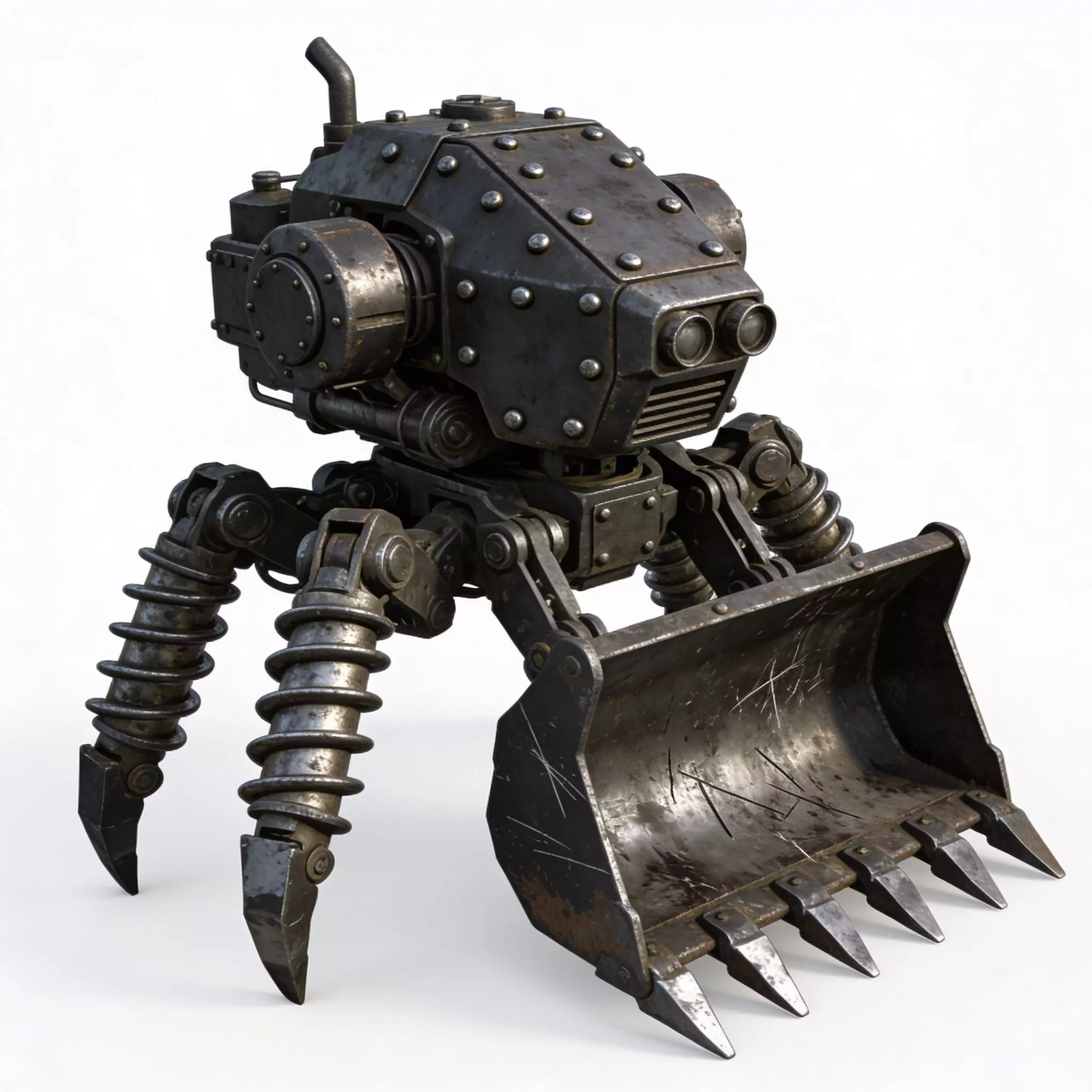 Cast Iron and Bolted Steel FinishThe badger features a primary body finish of heavily bolted cast iron and dark industrial steel, meticulously modeled with realistic surface oxidation, massive iron-oxide pitting along the rivet seams, and prominent weather-beaten tarnish. This professional and grounded appearance provides a clear visual story of high-performance excavation hardware subjected to extreme subterranean pressure and providing a sharp visual contrast against the dark ocular sensor lenses.