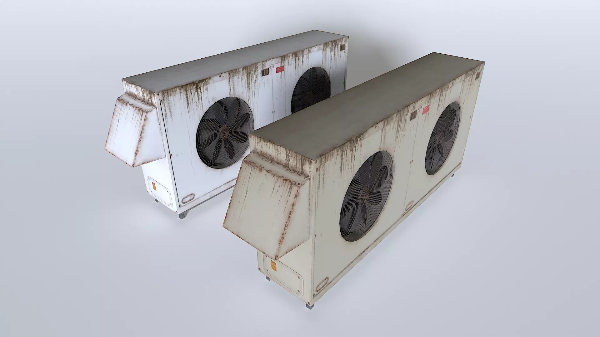 Rusty and old roof AC hvac. Real scale but scale as you needs. 1 material. Comes as full mess or with separated fans in case they need to be animated. 2 sets of colors.