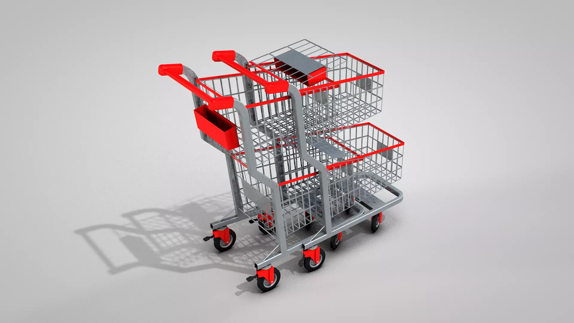 Shopping Cart - Two Baskets 3D created in Cinema 4D and exported to other formats: fbx, obj, dae, obj, blend, glb, and c4d. The texture is basic, and you can define the color of the Shopping Cart - Two Baskets. It has side panels where a logo can be applied.The wheel axles, brakes, and railings are correct and aligned.I hope you like it and find it useful.Thank you for visiting, renatodalle