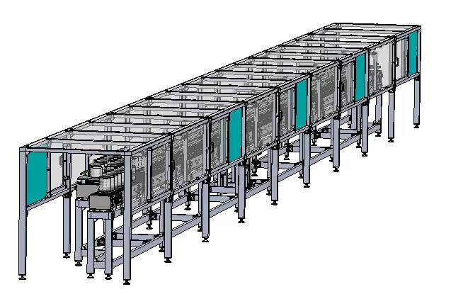 This conveyor consists of 3 modular belt conveyors of 17 meters, which are taken to cool the plastic bottles in water filling factories after they leave the blowing process, and are installed side by side on a stainless chassis. The two belts turn in one direction, the conveyor in the middle rotates in the opposite direction. Two AC motors are used in total. With the design for the conveyor design and the AC motor placement, the conveyor can run in two directions. The chassis consists of an aluminum sigma profile. As required by law, the conveyor top and sides are surrounded by a protective chassis with plexiglass covers. This chassis also consists of sigma profile. Its side covers are movable and sliding. Design files are loaded with all the details. The material list and technical drawings are in the files with all their details.