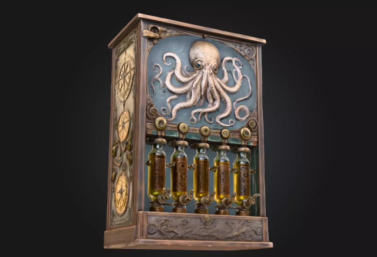 Quench your thirst for the forbidden with this unique Steampunk Cthulhu Vending Machine. This asset perfectly merges Victorian industrial engineering with Eldritch horror aesthetics, acting as a functional dispenser for mysterious elixirs, tonics, or sanity-restoring draughts in your game world.