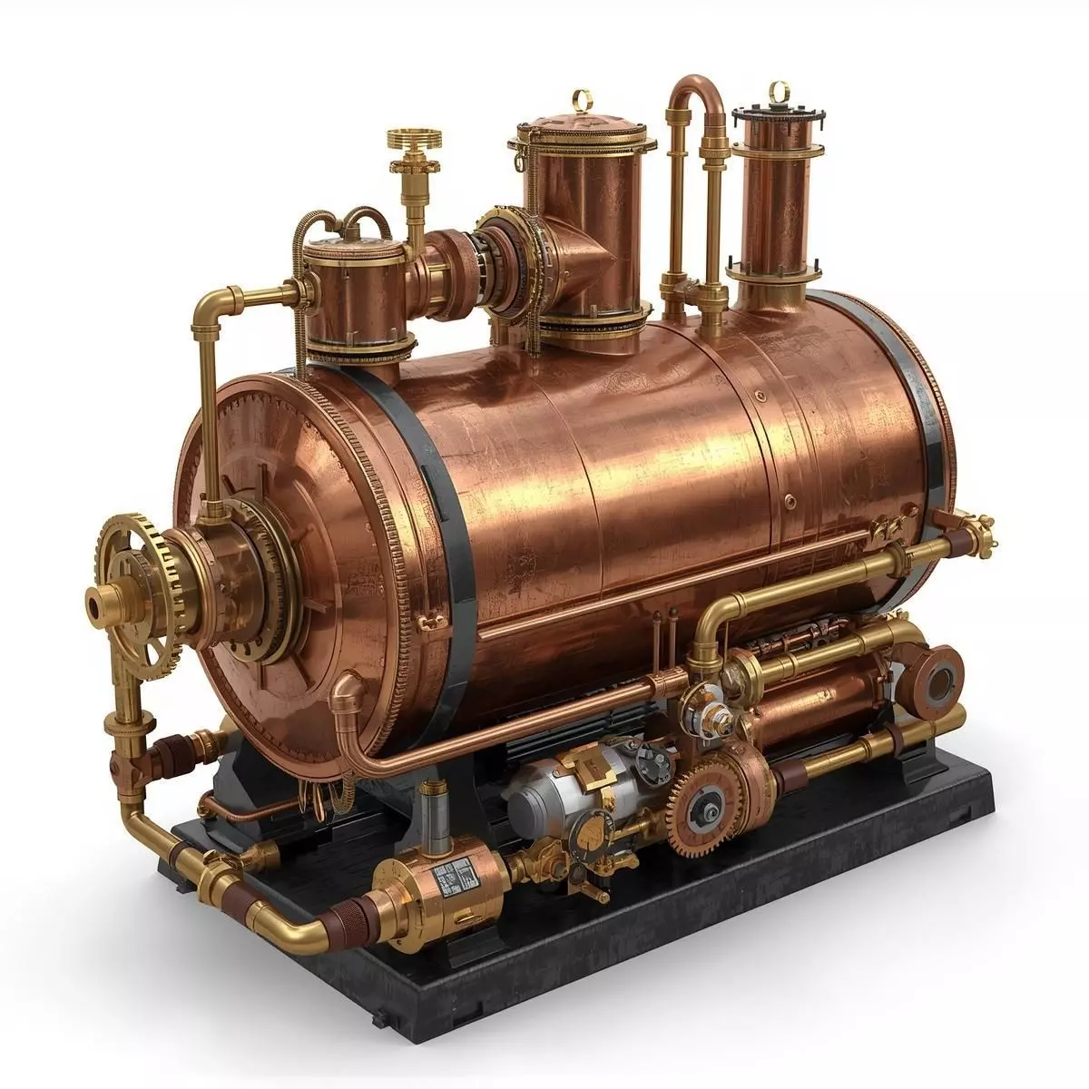 Key FeaturesDetailed Copper Boiler Core: Features a high-resolution cylindrical boiler with realistic metallic oxidation, scratches, and industrial riveted plating.