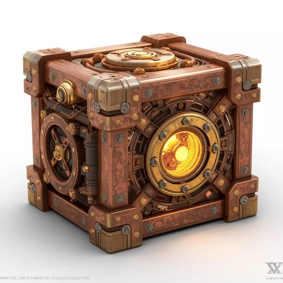 This premium, high-fidelity 3D model features a specialized industrial power crate designed with a sophisticated Victorian steampunk aesthetic. The unit is constructed with a robust cubic framework featuring reinforced brass and copper edges, heavily secured with industrial-grade rivets.