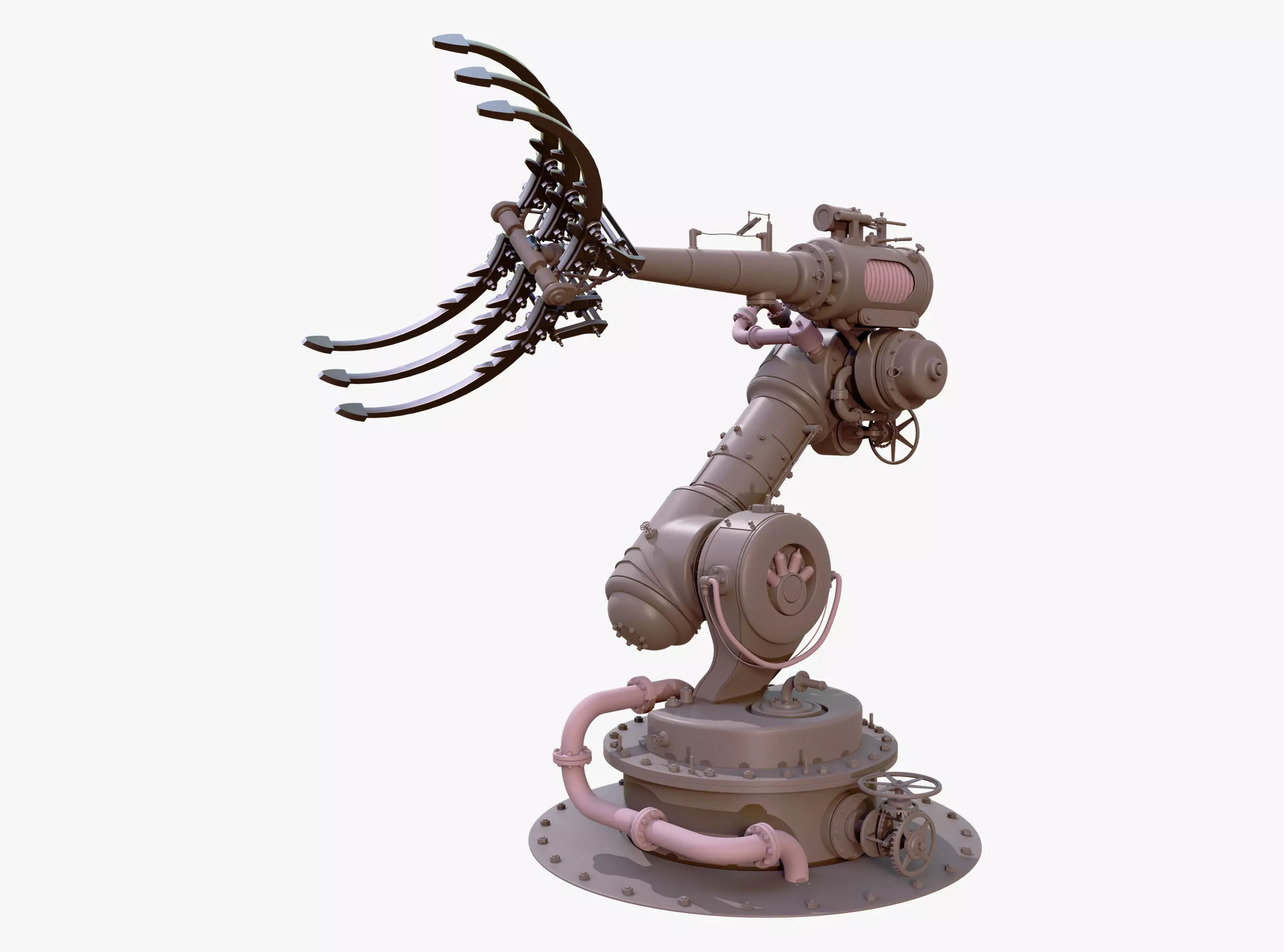 Industrial claw manipulator executed in an expressive Steampunk style. The design represents a complex mechanical assembly blending steam engine aesthetics with robotics.