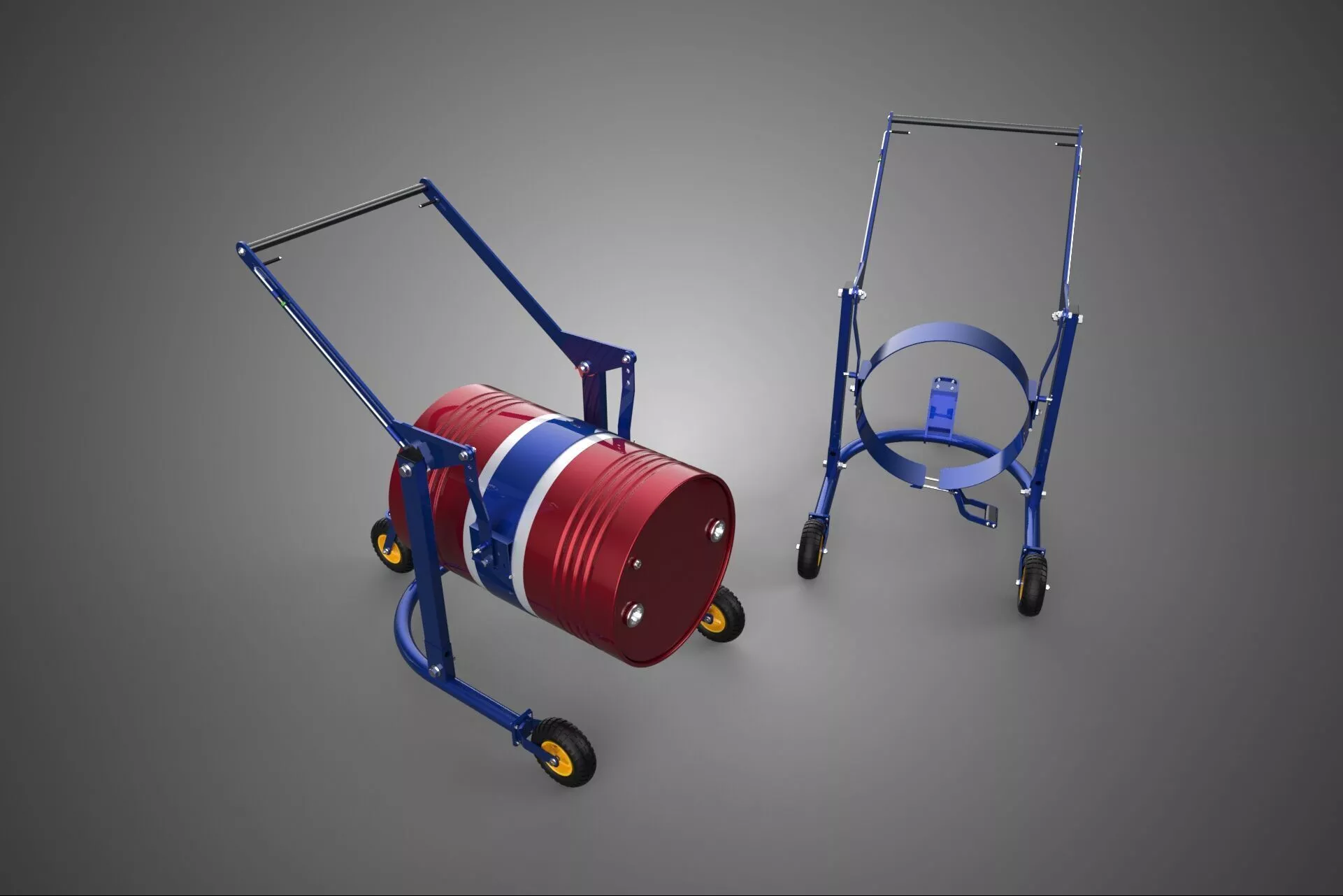 KEYWORDS: drum, trolley, barrel, cart, caddy, handtruck, industrial, warehouse, steel, transport, logistics, ergonomic, wheels, equipment, safety, metal, handling, utility, manufacturing, storage