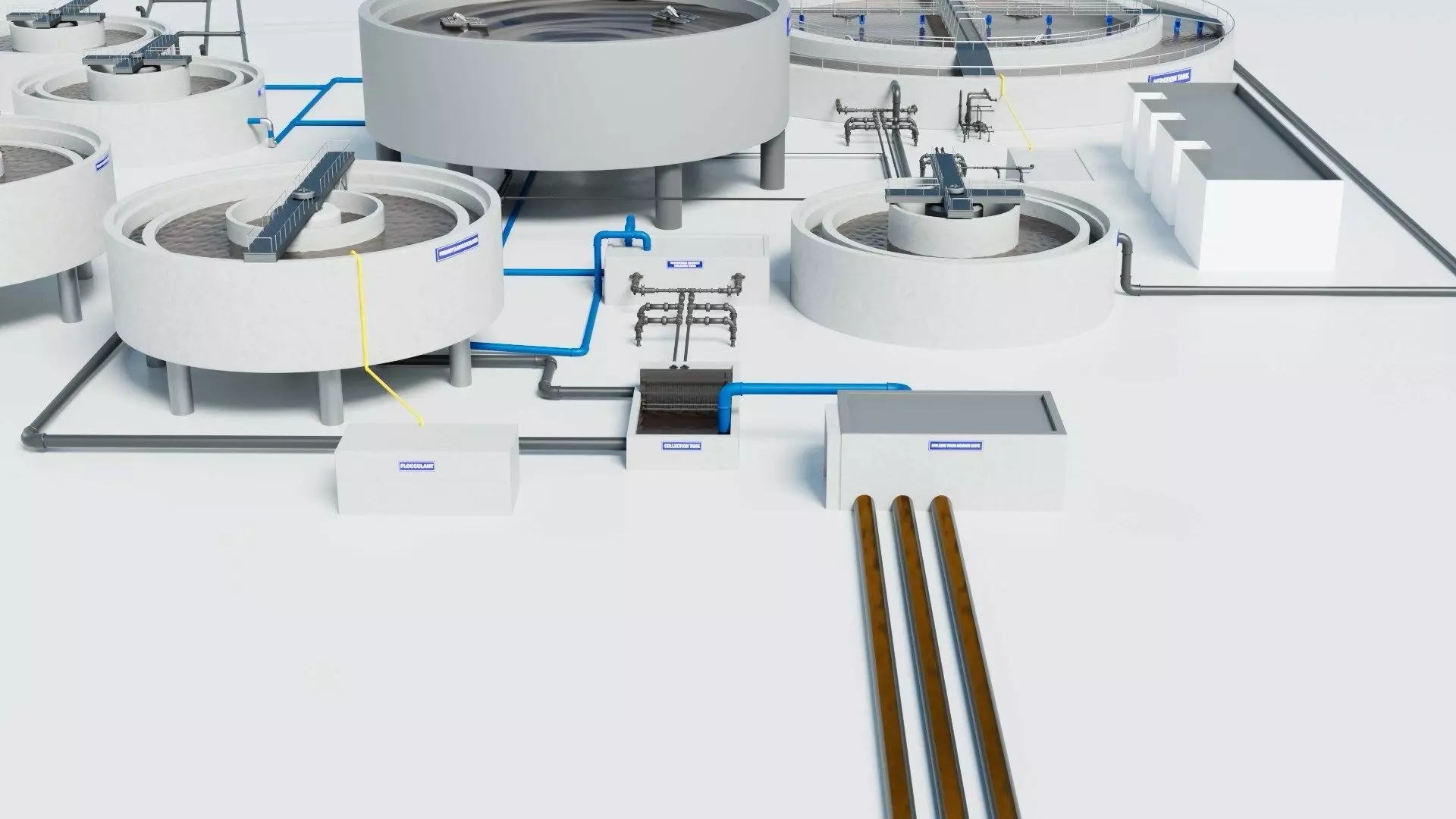 Secondary Clarification: Additional settling occurs to remove excess biomass formed during biological treatment, as seen in the clarifier tanks.
