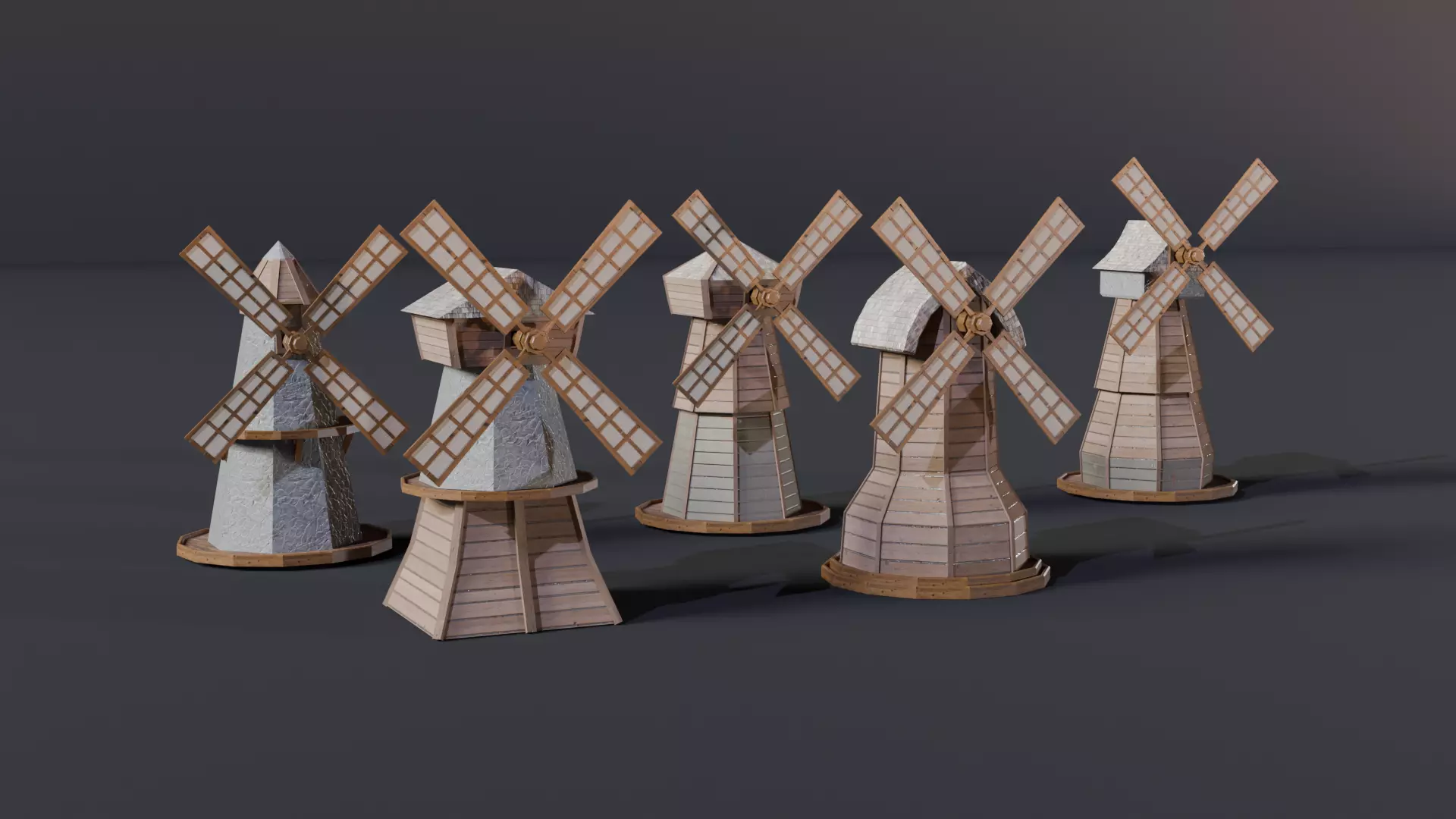 • Polygon count of each model: Windmill_01 - 833 VerticesWindmill_02 - 1065 VerticesWindmill_03 - 976 VerticesWindmill_04 - 870 VerticesWindmill_05 - 894 Vertices
