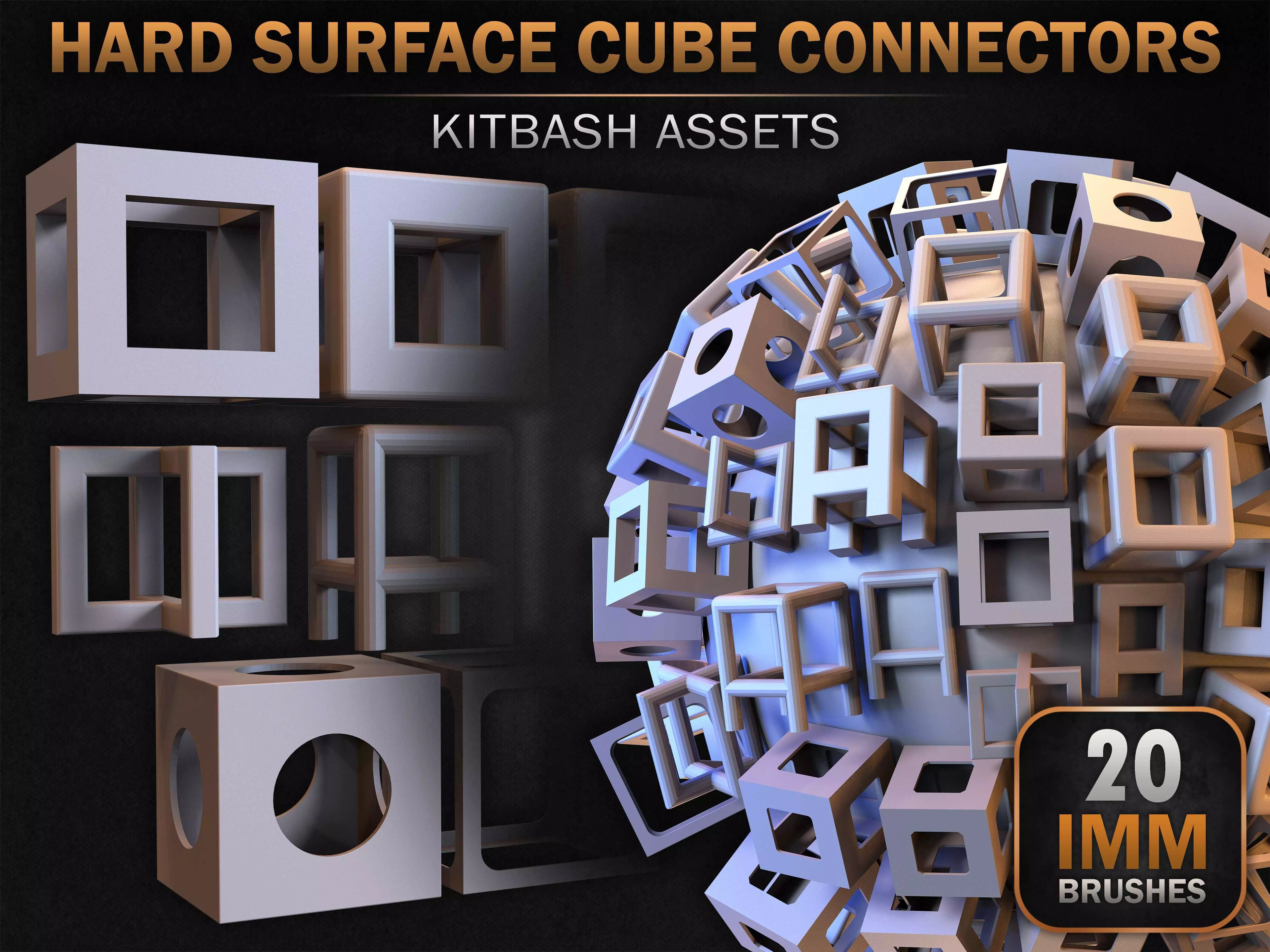 I am presenting a focused collection of 20 hard surface IMM cube connector elements, structured for modular construction, structural assemblies, and advanced hard surface workflows.