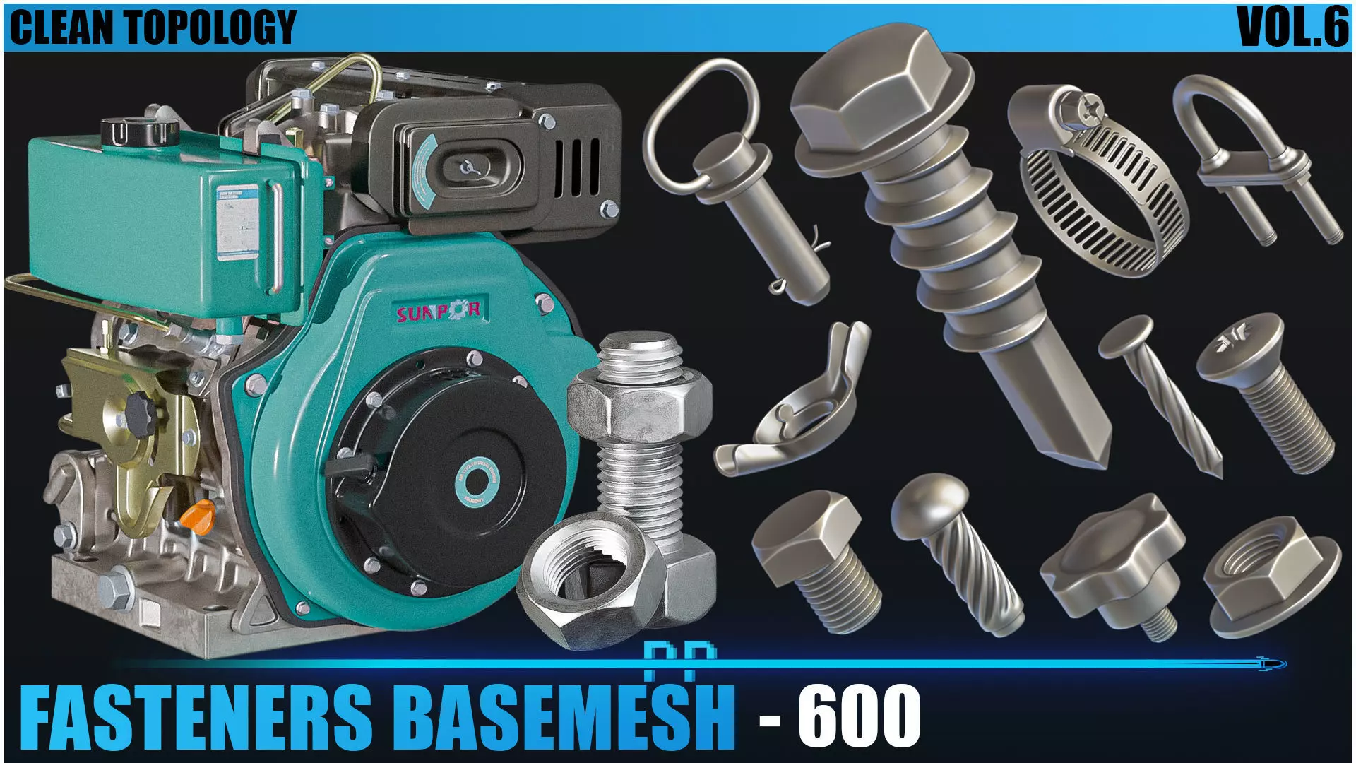600 types of 3D fasteners in FBX, and BLEND formatsboth base and beveled files included(just add subd for highpoly)