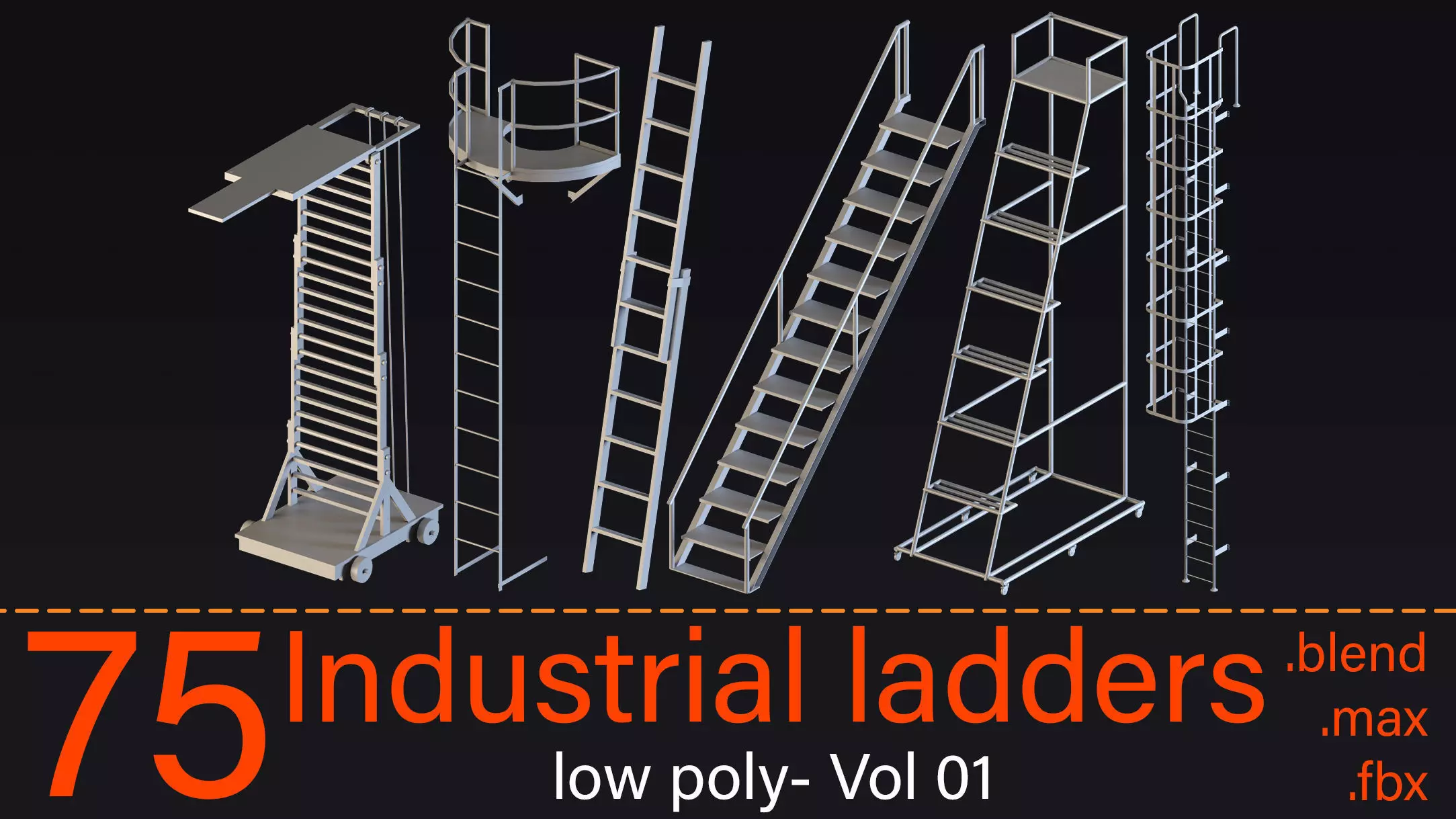 This product includes 75 Industrial ladders, Low poly 3d models in 3 different file formats that you can use in any software