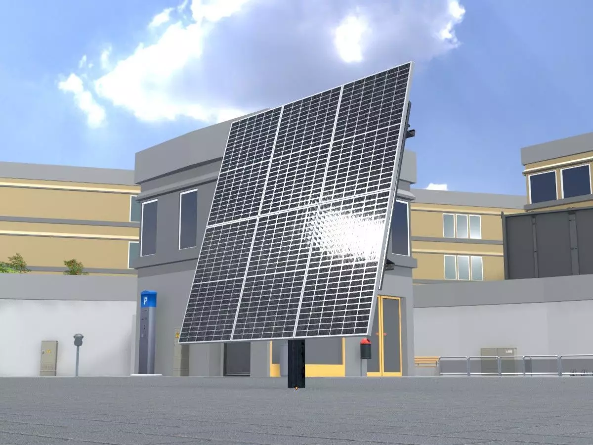 • Here you can see a 3D model of an agrivoltaic solar system with an inclination angle of 165° and a width of 4 meters.