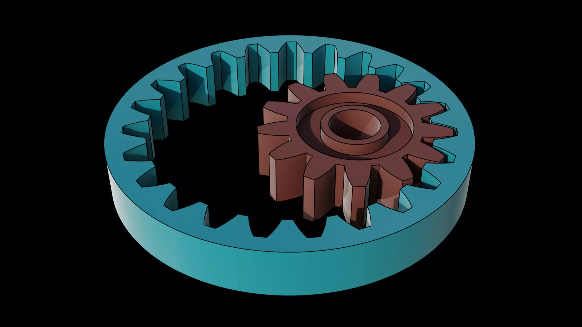 An internally toothed spur-gear and pinion. With ordinary spur-gears the direction of rotation is opposite; but with the internally toothed gear, the two rotate in the same direction; and with the same strength of tooth the gears are capable of transmitting greater force, because more teeth are engaged.