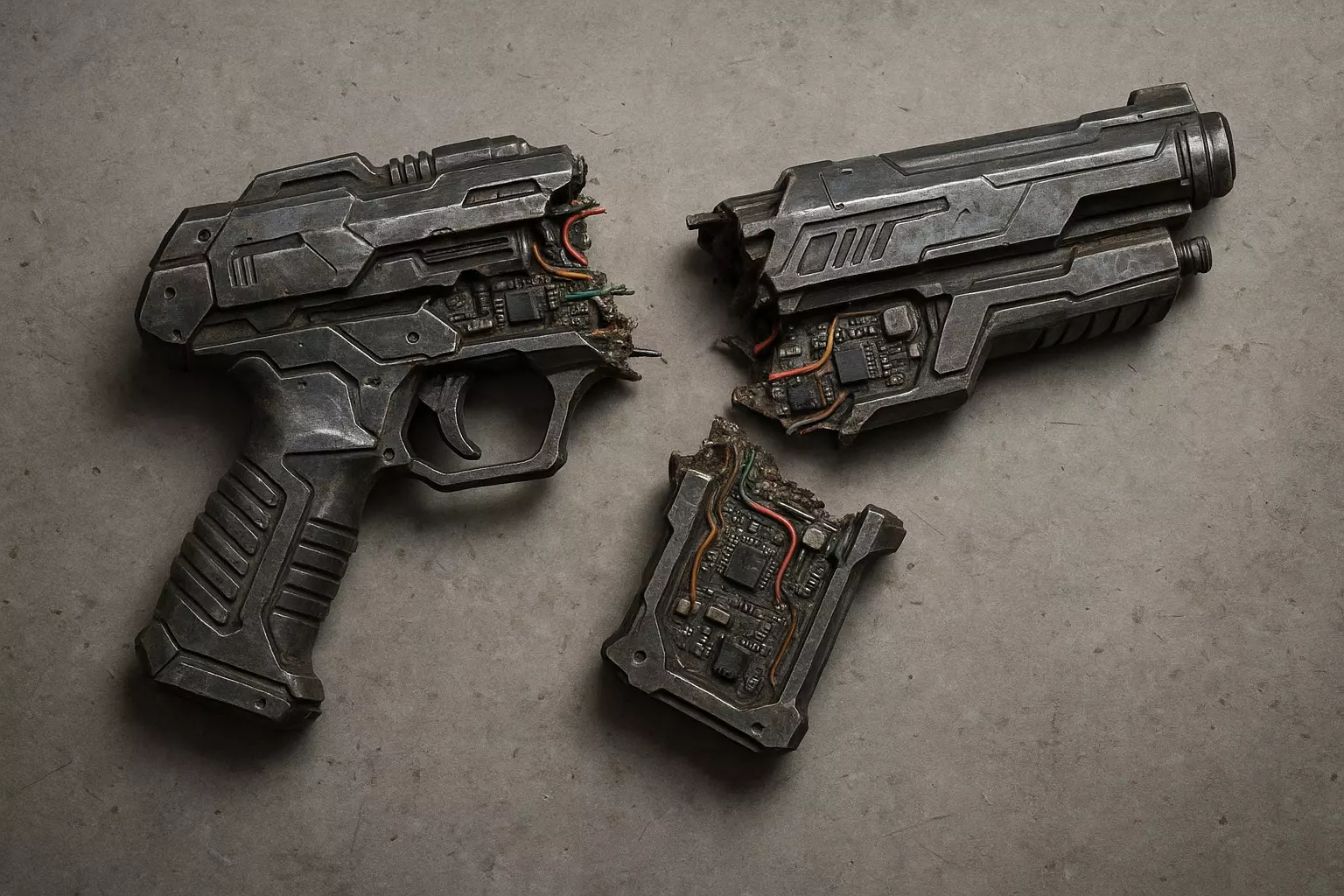 This 3D model represents a blaster gun broken in half, suitable for games, advertising, film, and VFX.