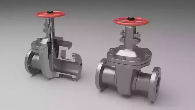 High-quality 3D model of an Industrial Flanged Gate Valve, including both a complete exterior and a detailed sectional cutaway version.