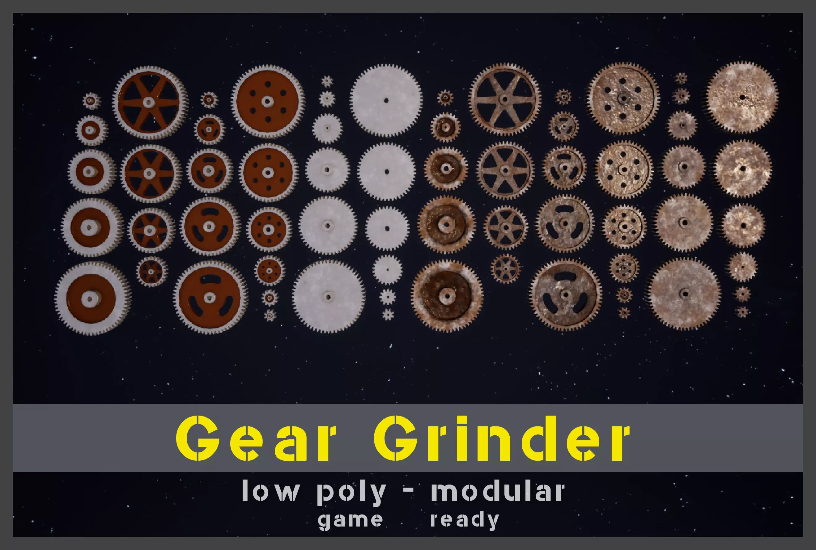 This asset pack consists of 32 low-poly gear elements used for creating different setups of gear mechanisms. These elements are based on mechanical accuracy allowing for modular use as well as single implementation. The set was created on a set module that allows for a complete mix and match of the elements. Along with a standard texture set, a grimy / old hand painted texture pack is also available with this set.