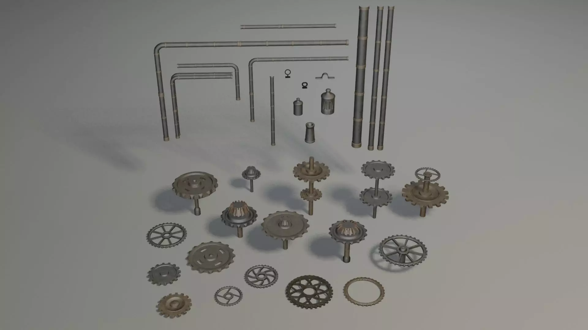 These models of gears and tubes can be used for your games, renders or videos, set in magical, industrial, steam punk and adventure places.