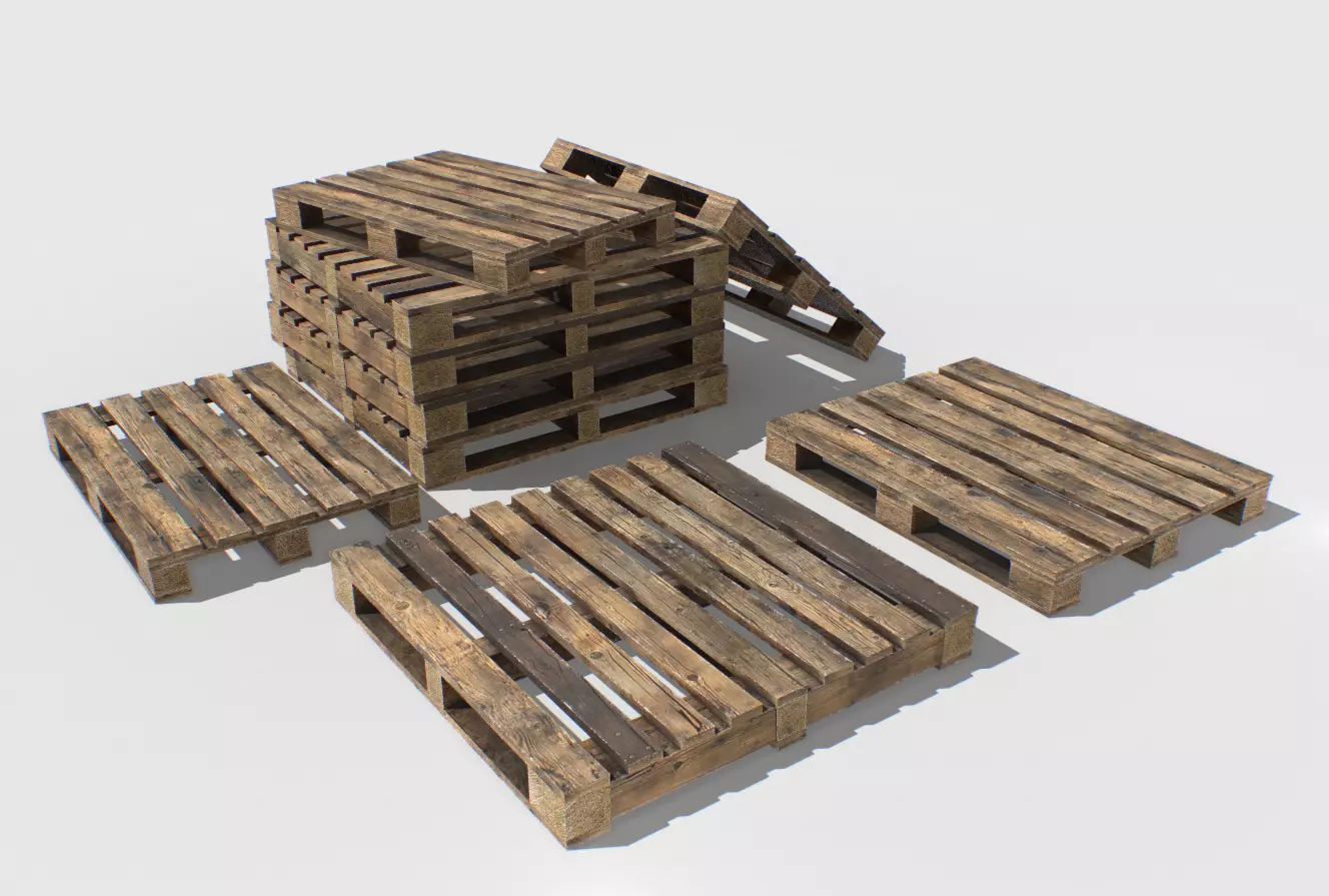 Industrial pallets based in real ones. 3 pallets included: 1200x1200 1200x1000 and 1200x800 cm.