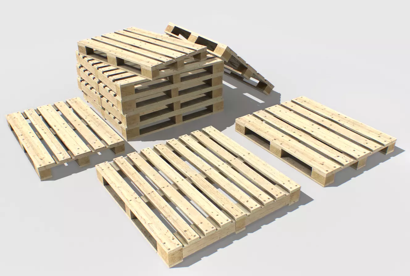Industrial pallets based in real ones. 3 pallets included: 1200x1200 1200x1000 and 1200x800 cm.