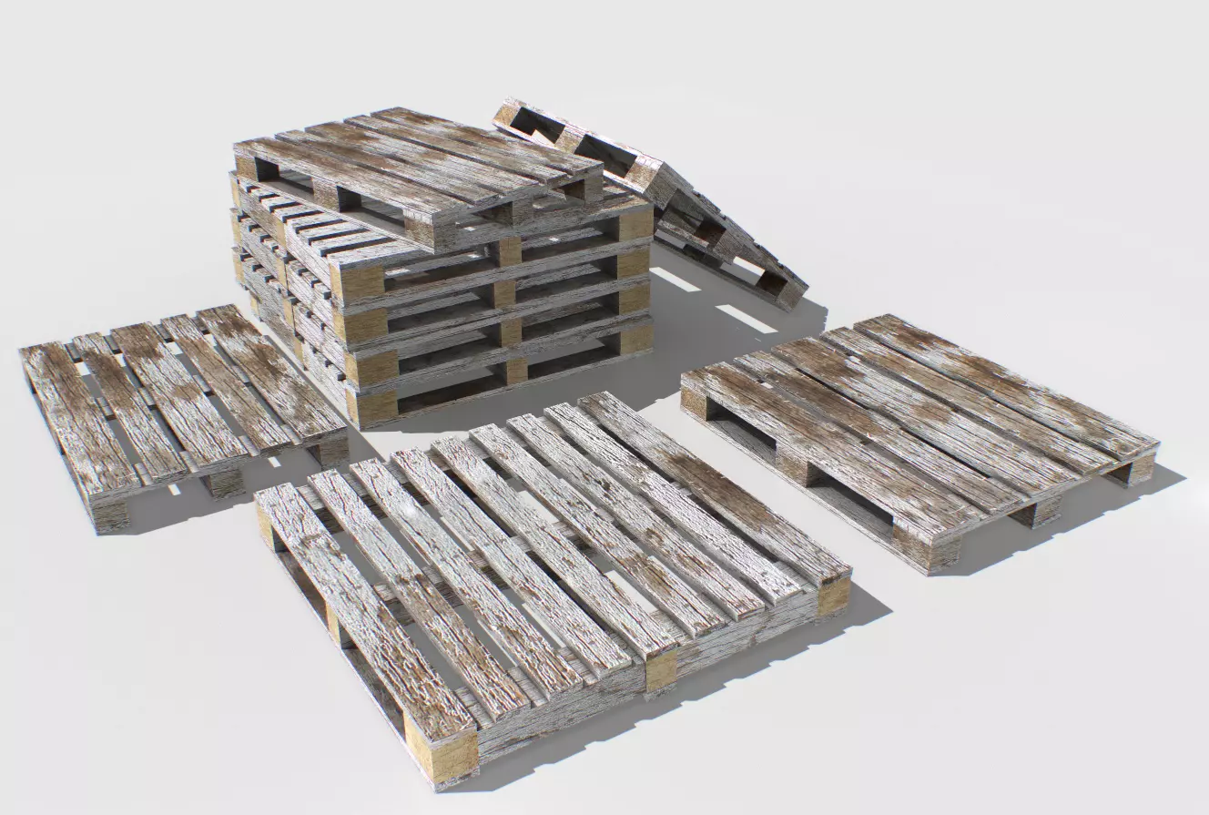 Industrial pallets based in real ones. 3 pallets included: 1200x1200 1200x1000 and 1200x800 cm.