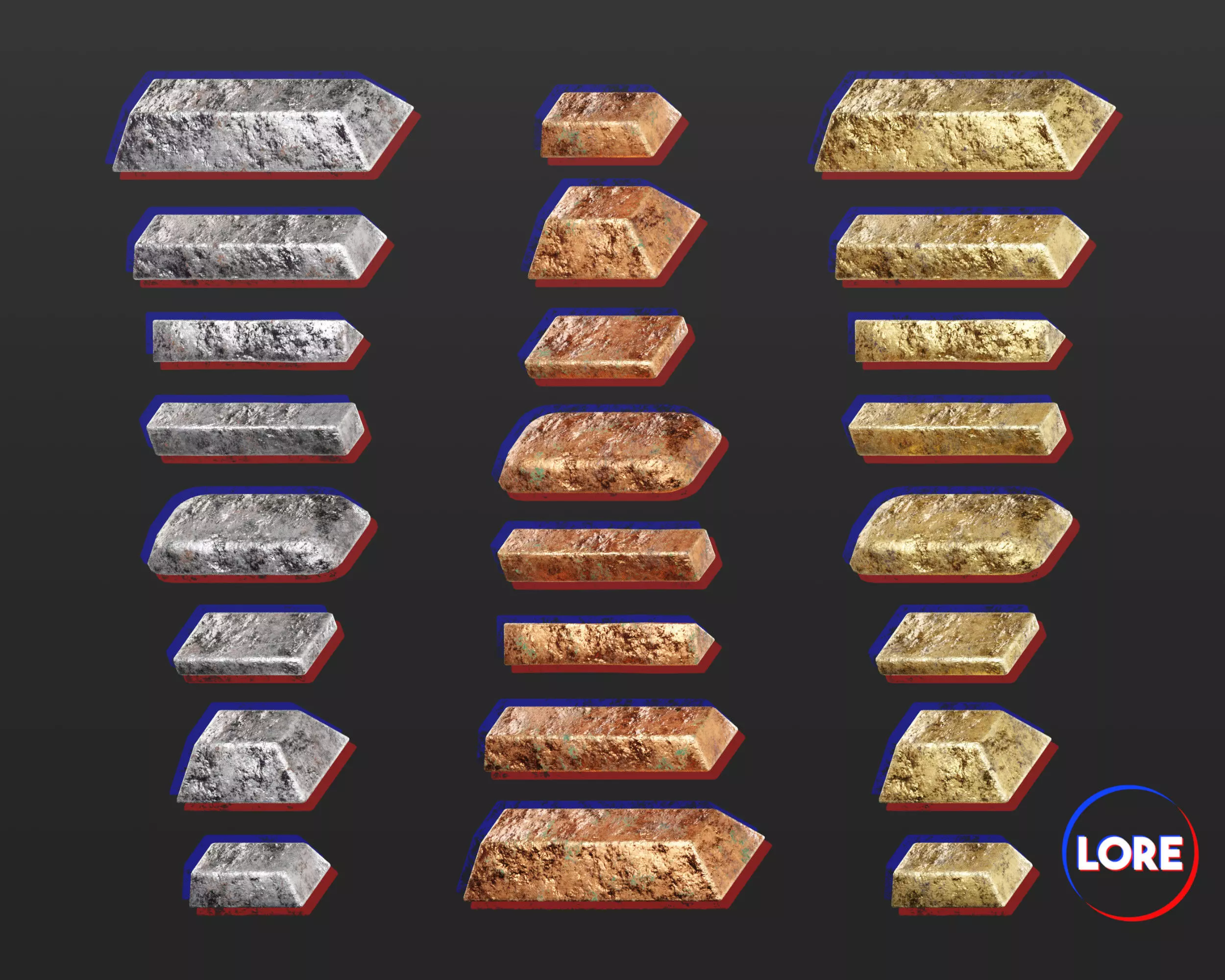 • This is a set of 8 different metal bars and ingots for decorating a treasure room or for adding to a blacksmith environment. A variety of shapes and colors are included for added customization options. Models are labeled A - F.