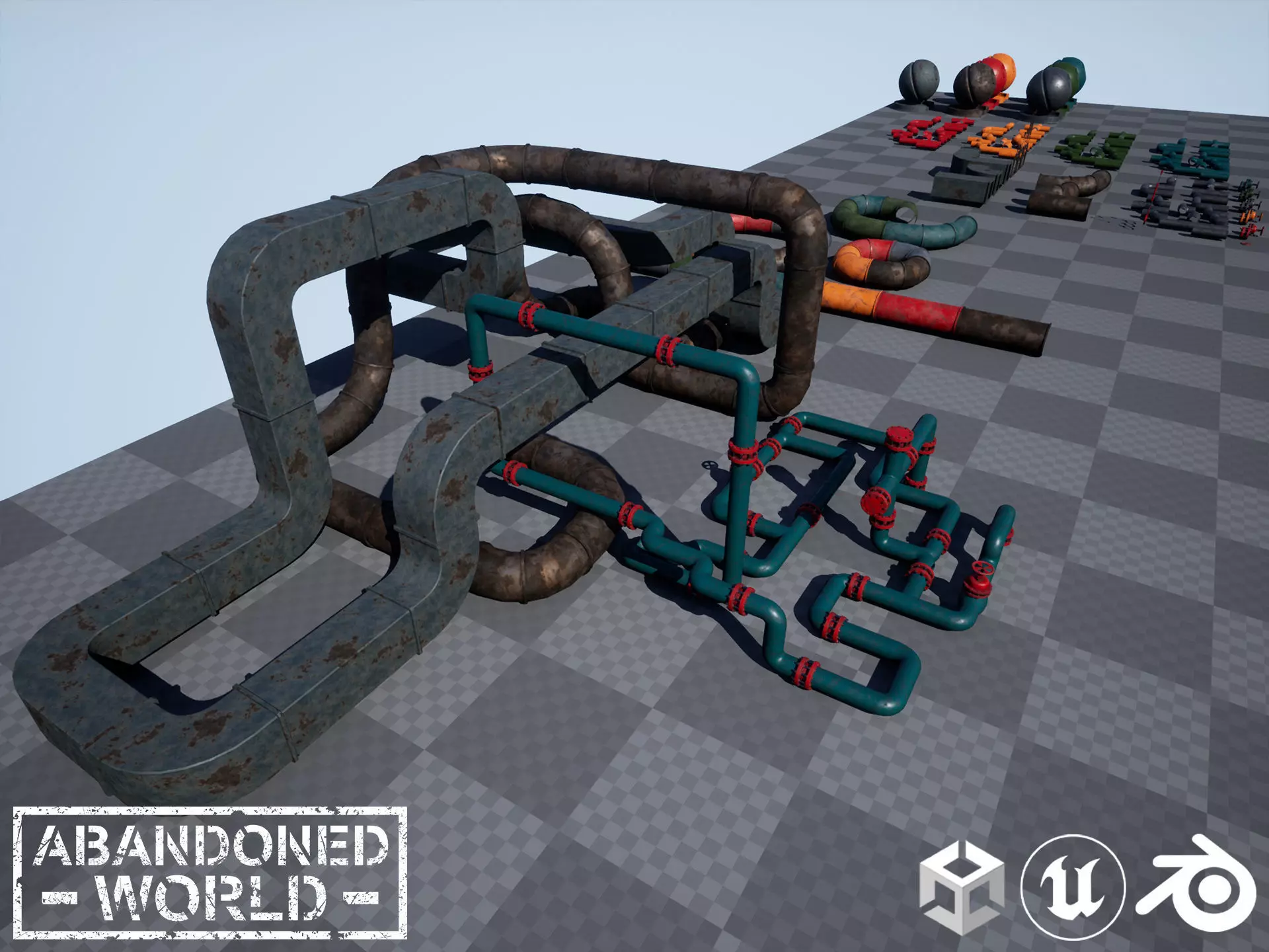 A set of modular pipes with different texture options. The kit includes modular piping elements, with which you can create a pipeline of any complexity. There are mounts on the ceiling, and a bonus in the package added square and large thick pipes. The package has several variations of materials, you can select and change the color by changing the material of the model to one of the available. And also to all pipes it is possible to apply any seamless material of metal which you have.