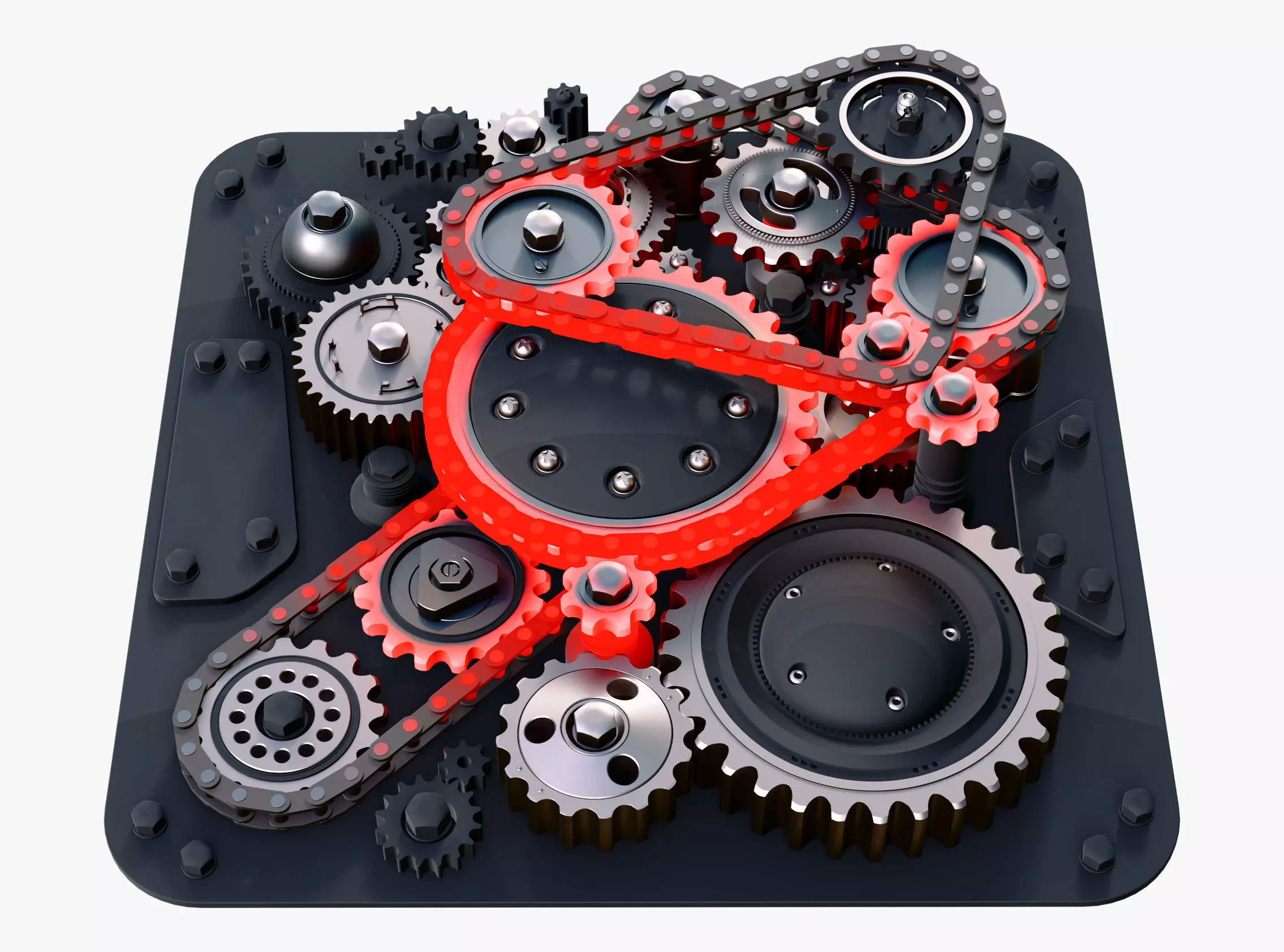 A gear mechanism on a platform demonstrating the effect of severe overheating. The structure consists of multiple metallic gears and chain drives of various sizes. The main visual feature is that the central elements are heated red-hot, simulating metal glowing from friction.