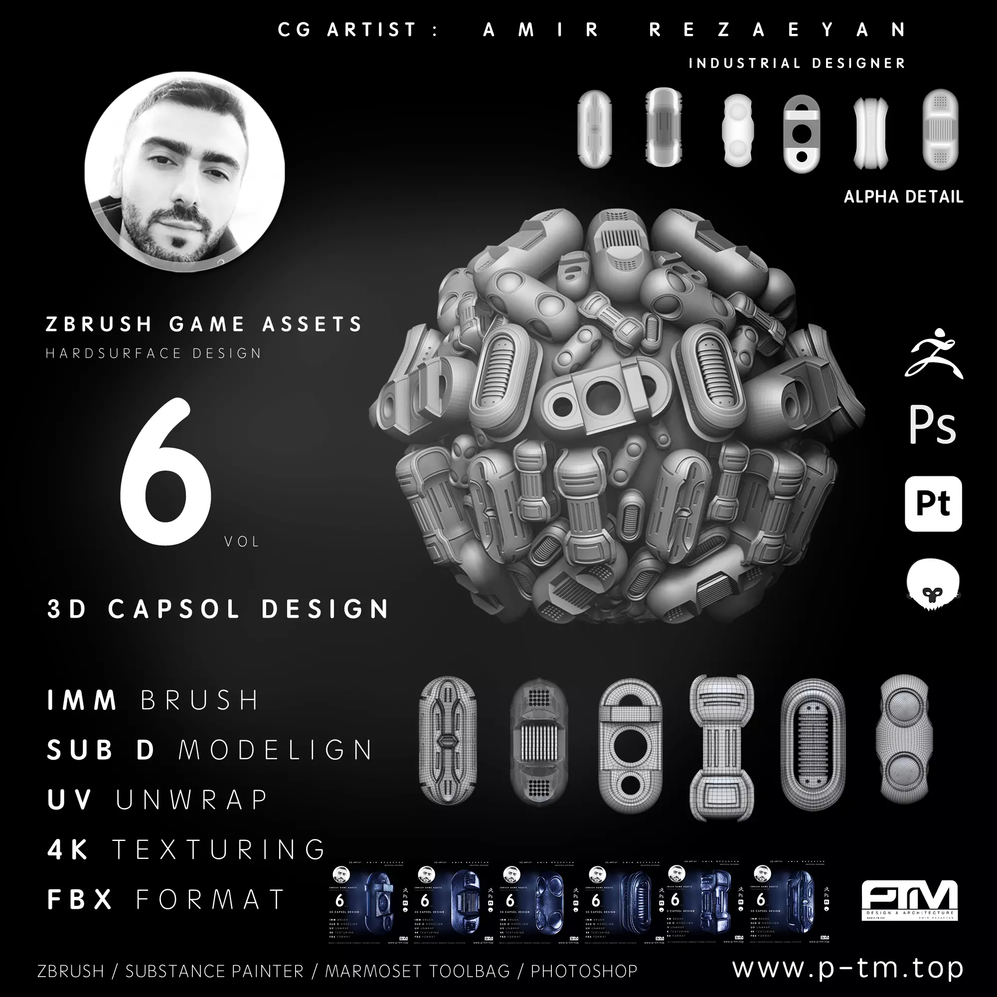 C G A R T I S T : A M I R R E Z A E Y A NH A R D S U R F A C E D E S I G N - Z B R U S H 2023T I T L E : PTM - ZBRUSH - 3D CAPSULE - GAME ASSET - VOL 1.0.0S U B J E C T : 3D CAPSULE ASSETS - VOL 1.0.0D E S I G N E R : A m i r R e z a e y a n3 D S O F T W A R E A P P L I C A T I O N : ZBRUSH 2023I N C L U E I N 3 D P A C K A G E6 PREVIEW RENDER FILE FOR EACH 3D MODEL6 SUB-D | BOX - MODELING IN ZBRUSH6 FBX 3D FILE WITH UV ( UNWRAP ) > ( L-POLY ) & ( H-POLY ) AVAILABLE6 PRINTABLE 3D FILE AVAILABLE6 EDITABLE 3D MODEL ASSET MADE IN ZBRUSH6 CUSTOM IMM BRUSH FOR ZBRUSH6 MATERIAL FOR SUBSTANCE PAINTER6 SUBSTANCE PAINTER TEXTURE INCLUDE :( NORMAL MAP ) - ( DISPLACEMENT MAP ) - ( ALBEDO BASE COLOR MAP ) - ( ID COLORMAP ) - ( AMBIENT OCCLUSION MAP ) - ( CURVATURE MAP ) - ( POSITION MAP ) -( THICKNESS MAP )N O T E