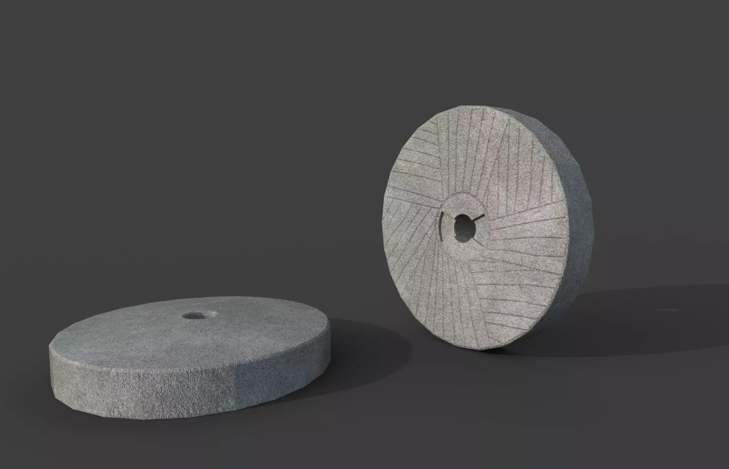 Low-poly set of historic millstones for a water mill or wind mill. The conical shape of the bottom stone lets the grinded flour flow to the outside, while the upper stone has grooves to help grinding the grain. Also the upper stone’s bottom side has butterfly shaped indents to house a iron suspension.
