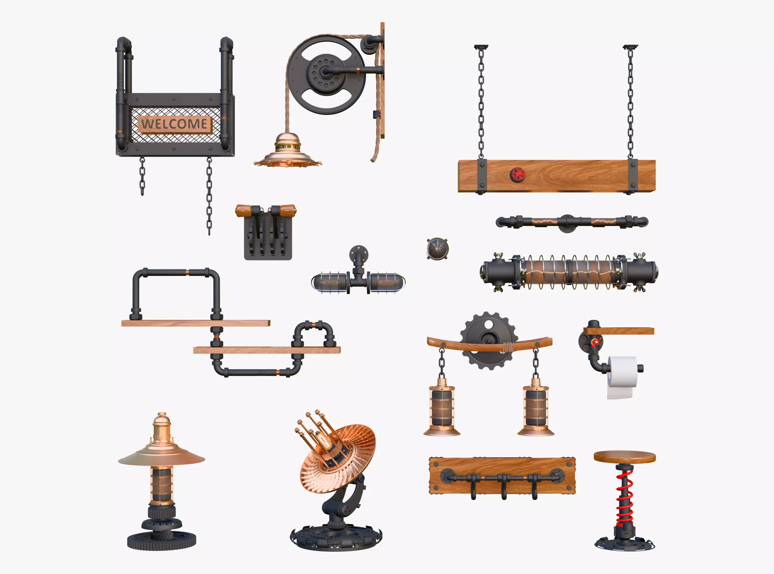 Set of 15 decorative 3D models designed in expressive steampunk and industrial loft styles. This collection features diverse decor, lighting, and furniture, where black metal pipes and mechanisms harmoniously blend with natural wood and copper details.